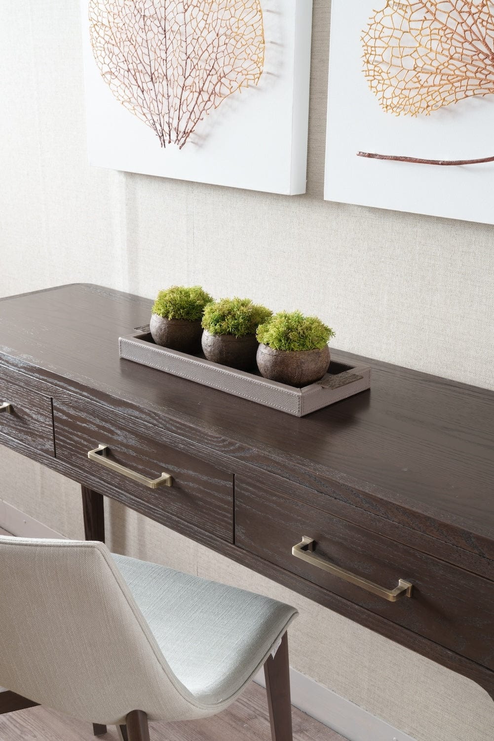 Bronze Lava Greenery Bowl: A Masterpiece of Nature and Artistry Introduction to Timeless Elegance Introducing the Bronze Lava Greenery Bowl , a remarkable blend of natural inspiration and artisanal craftsmanship. This unique piece stands as a testament to exclusive design, transforming any room with its compelling presence and refined aesthetic. Unique Design Elements The Bronze Lava Greenery Bowl is not just a vessel; it's a piece of art. Cast from high-quality bronze, it features a distinctive textured finish that mimics the dynamic, unpredictable patterns of flowing lava. This rugged texture contrasts beautifully with the lush, vibrant faux moss nestled within, creating an effect that is both striking and soothing. Incorporating Natural Beauty This bowl goes beyond traditional decor by incorporating elements of the natural world directly into its design. The addition of faux moss does more than just enhance its visual appeal—it brings a piece of the outdoor serenity indoors, offering a green, verdant touch that enlivens any space. Versatility in Decor Whether you're aiming to captivate guests in the foyer or enrich the ambiance of your living room, the Bronze Lava Greenery Bowl adapts to any setting. Its versatile nature makes it perfect for a variety of display options, from being a standalone focal point to part of a larger, thematic decor arrangement. Durable Craftsmanship Each bowl is meticulously hand-finished by skilled artisans, ensuring that no two pieces are exactly alike. This commitment to quality not only guarantees the uniqueness of each bowl but also ensures its durability and longevity as a staple piece in your home decor collection. Styling Tips Maximize the impact of your Bronze Lava Greenery Bowl by pairing it with minimalist decor to let its intricate design stand out, or complement it with other organic elements like wood or stone to create a cohesive natural theme. Ideal for any interior setting, it enhances modern, contemporary, or rustic decor styles effortlessly. Environmental Impact and Care Committed to sustainability, the creation of this bowl involves eco-friendly practices, including the use of recycled materials where possible. Caring for the bowl is straightforward—regular dusting and avoiding direct sunlight are recommended to preserve its vibrant appearance and intricate details. Bronze Lava Greenery Bowl: A Symbol of Elegance and Sustainability The Bronze Lava Greenery Bowl is more than just a decorative item; it's a commitment to sustainable luxury and artistic expression. It promises not only to elevate your home decor but also to inspire conversation and admiration from all who behold it. Embrace this exquisite blend of art and nature, and let your home reflect a truly sophisticated style. Choose the Bronze Lava Greenery Bowl for an interior that resonates with elegance and an appreciation for the artistry of nature. Bronze Lava Greenery Bowl You can also check our Hudson console and Wode rectangular tray putty , seen in the lifestyle picture above.