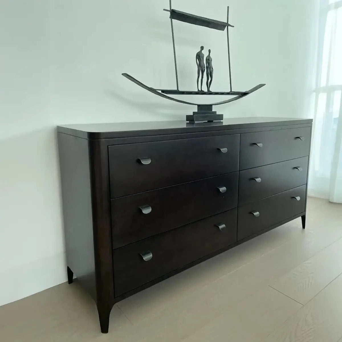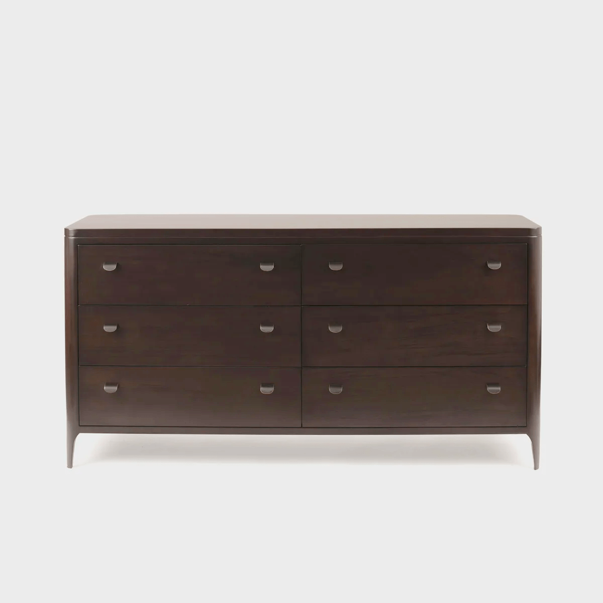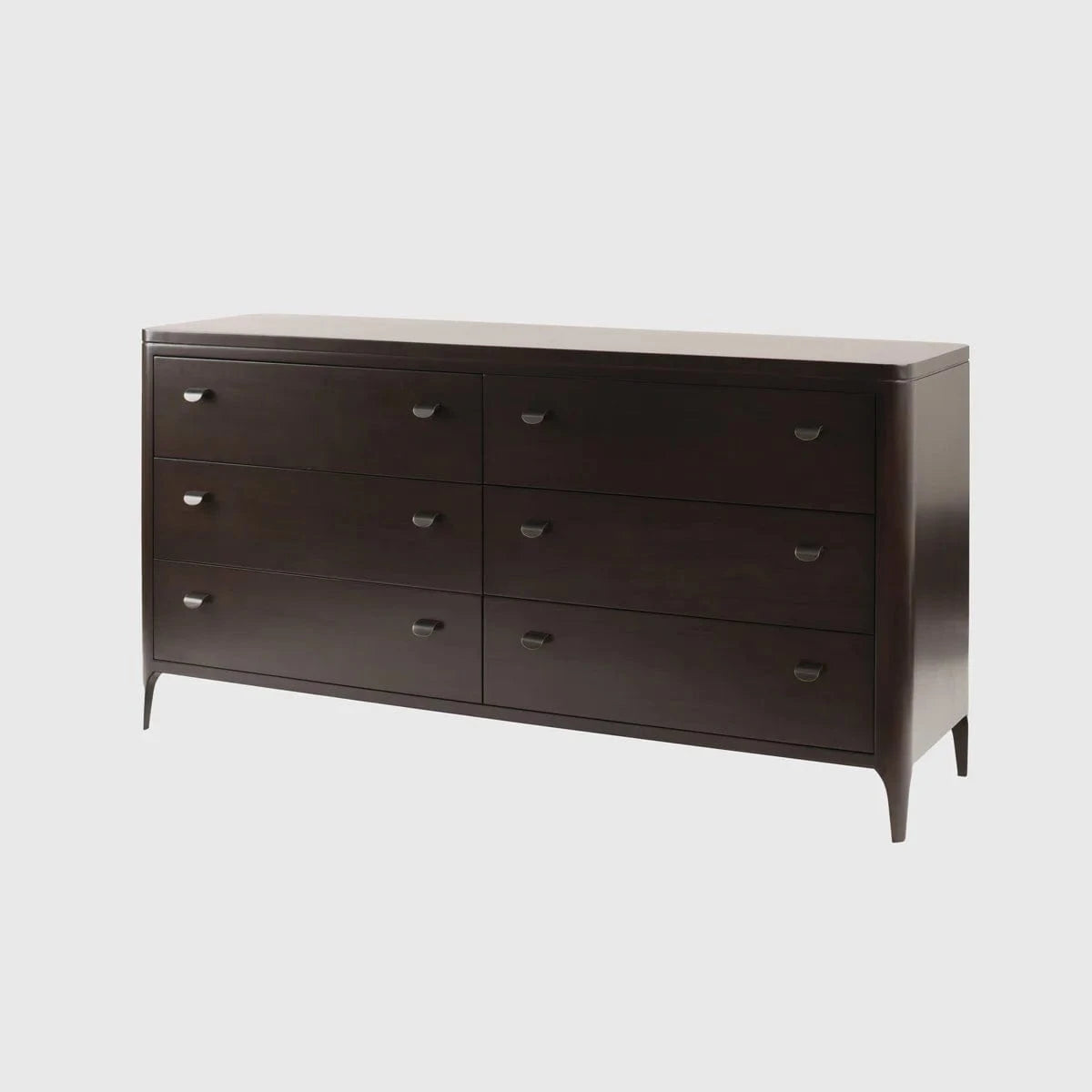 Introducing the Classic Plaza 6 Drawer Chest, a luxurious addition to our original furniture collection. This exclusive design from Eccotrading Design London exudes effortless luxury with its simple silhouette and gentle curves. The solid wood frame is beautifully veneered and finished in an elegant satin brown color, while the dark brushed bronze handles add a cohesive touch. Each drawer is fully lined and features a soft close mechanism for added convenience. Measuring at L: 158cm x D: 45cm x H: 80cm, this chest provides a pared back elegance and sophistication to any space.