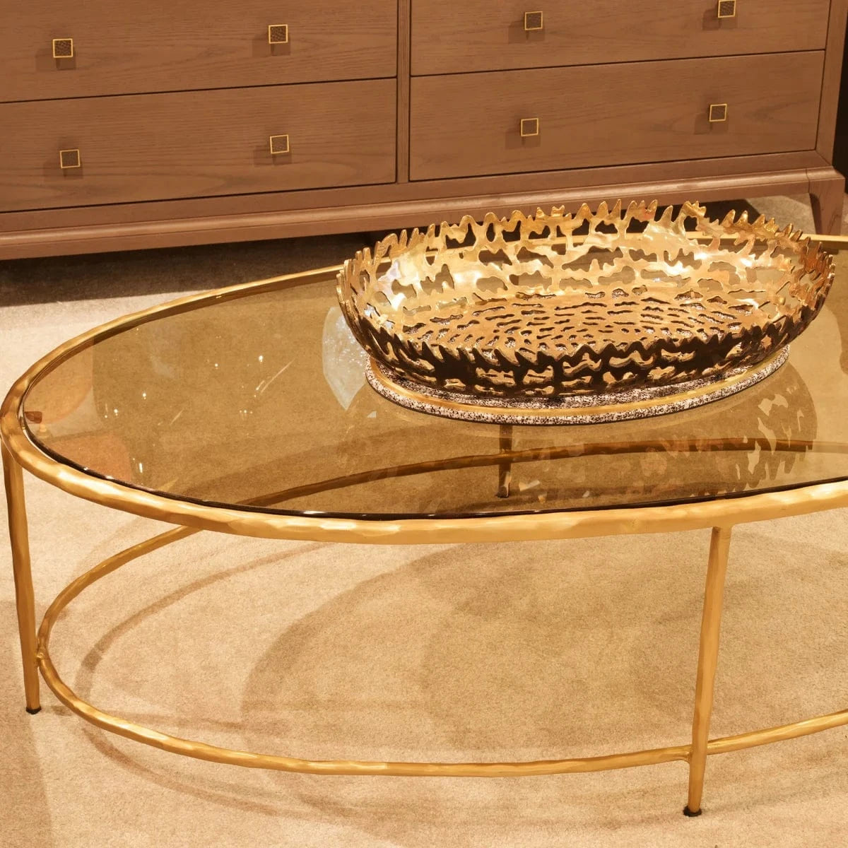 The handcast bronze D'oro base is not only visually striking but also built for durability, ensuring that this coffee table will remain a centerpiece in your home for years to come. The base's unique design showcases Eccotrading's signature attention to detail, blending artisanal craftsmanship with contemporary elegance.