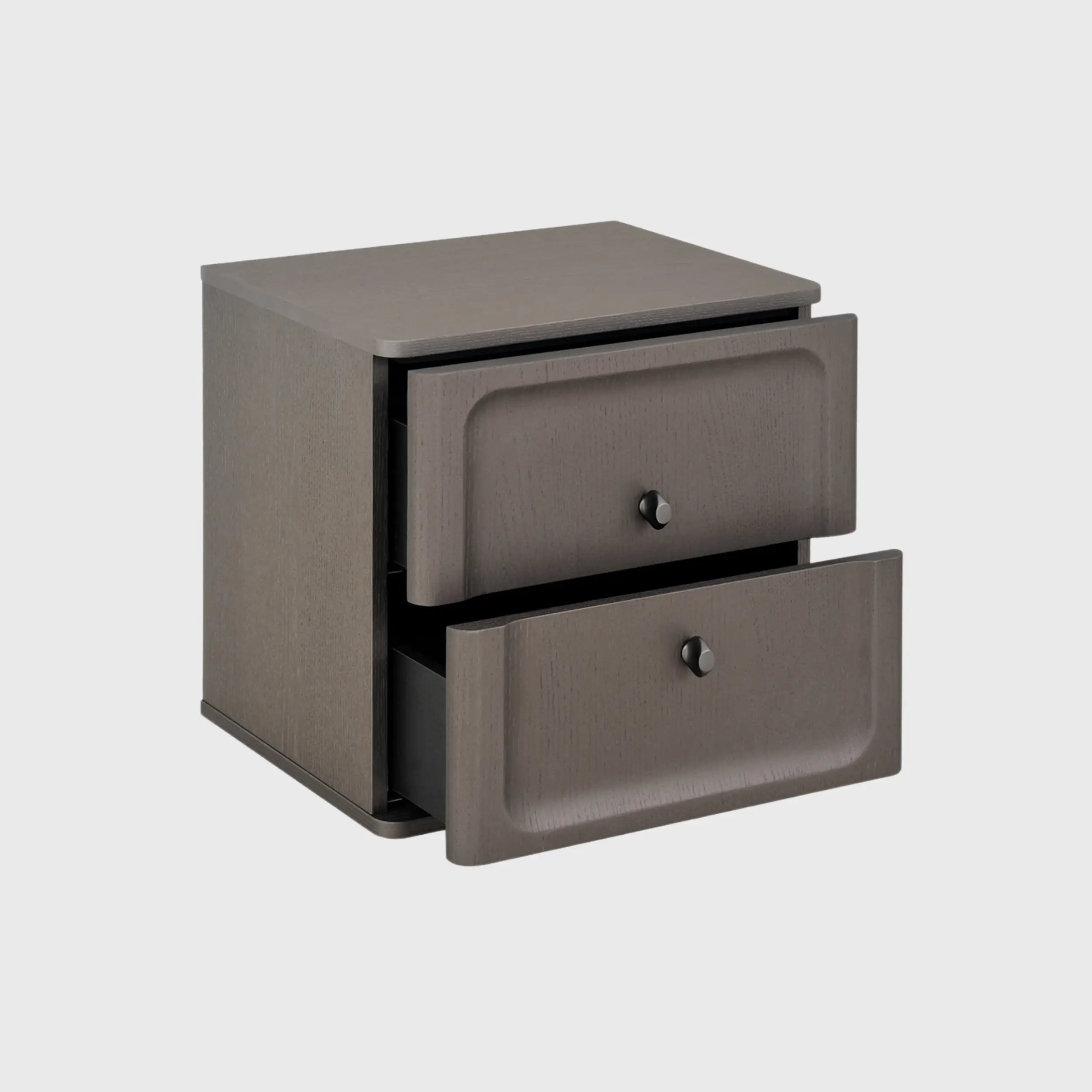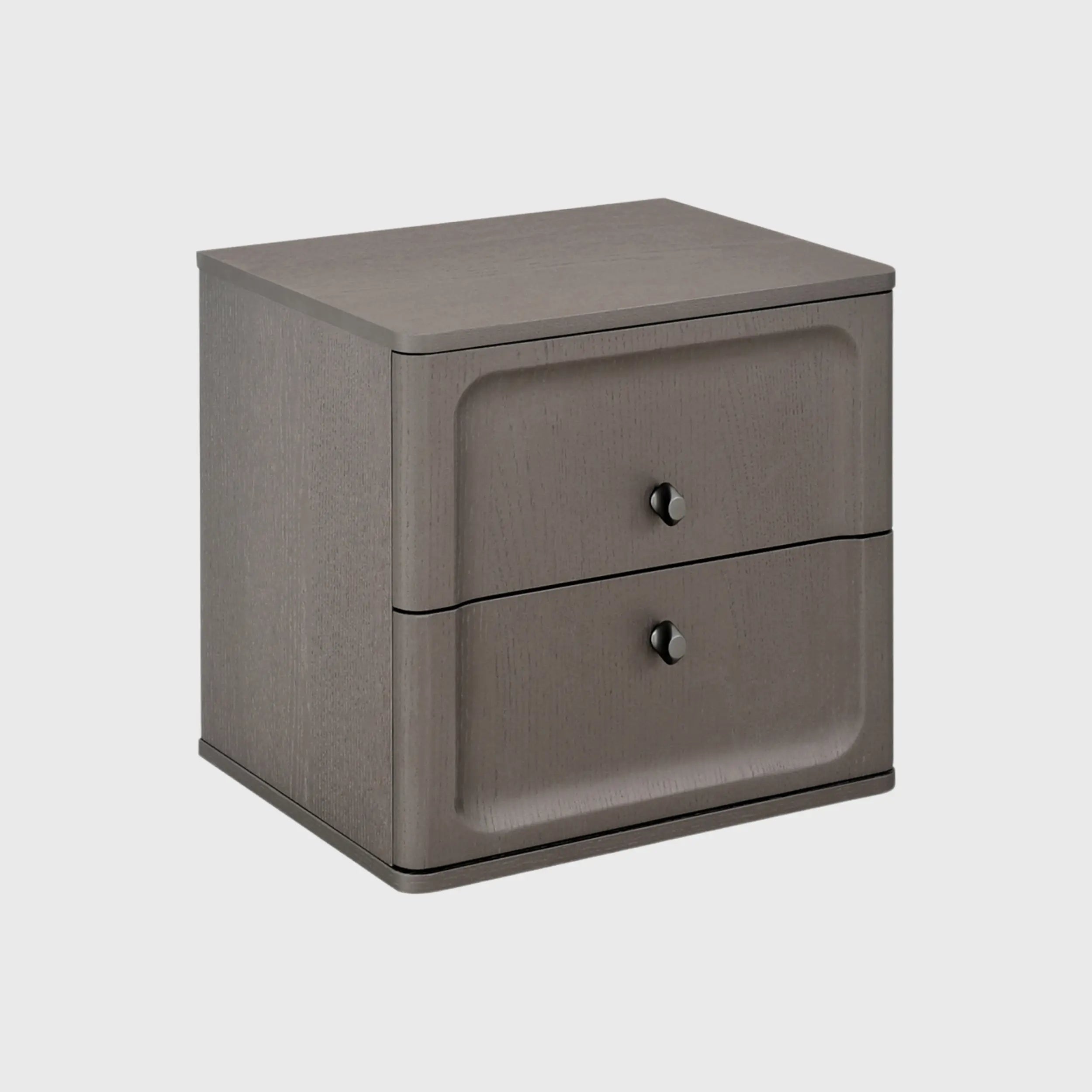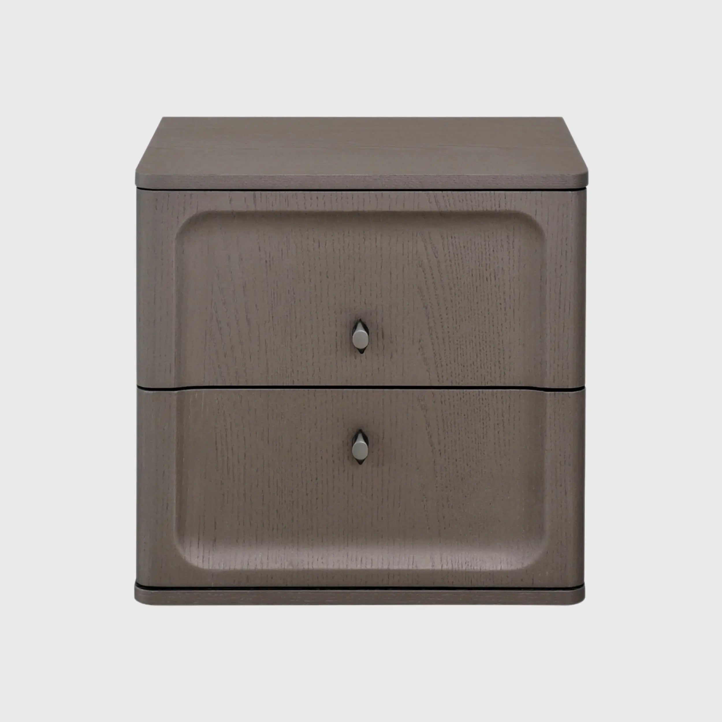 Impression Bedside Table in Pearl Brown Metallic with Soft-Close Drawers The Impression Bedside Table in Pearl Brown Metallic is a contemporary luxury bedside cabinet defined by its sculpted drawer fronts, refined metallic finish, and compact architectural form. Designed to bring both elegance and function to modern bedroom interiors, this two-drawer bedside table combines clean lines with tactile detailing and premium hardware performance. Finished in a pearl brown metallic tone, the surface delivers a soft reflective quality that adds depth and warmth without overpowering the space. The subtle metallic sheen enhances the geometry of the piece and pairs beautifully with upholstered beds, textured fabrics, and layered neutral palettes commonly used in high-end interiors. The bedside table features two generously sized drawers with integrated soft-close mechanisms, ensuring smooth and quiet operation. The drawer fronts are shaped with a recessed panel detail that adds dimension and a tailored look, while the refined metal knobs provide a discreet accent and easy everyday use. Its compact, grounded silhouette makes it ideal for both master bedrooms and guest rooms, offering practical bedside storage for essentials while maintaining a clean visual footprint. The balanced proportions also allow it to function as a small side cabinet or accent table in dressing areas and lounge spaces. Perfect for contemporary and luxury bedroom schemes, the Impression Bedside Table in Pearl Brown Metallic delivers a combination of durability, functionality, and sculptural simplicity.
