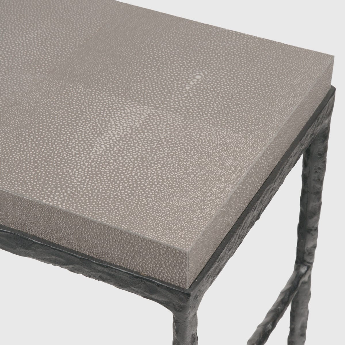 Topping the handcast bronze base is a sumptuous grey shagreen leather surface, adding a layer of refined luxury to the console. The grey shagreen leather, known for its unique texture and durability, provides a tactile contrast to the robust bronze base. This harmonious blend of materials creates a visually striking centerpiece that is both functional and aesthetically pleasing.
