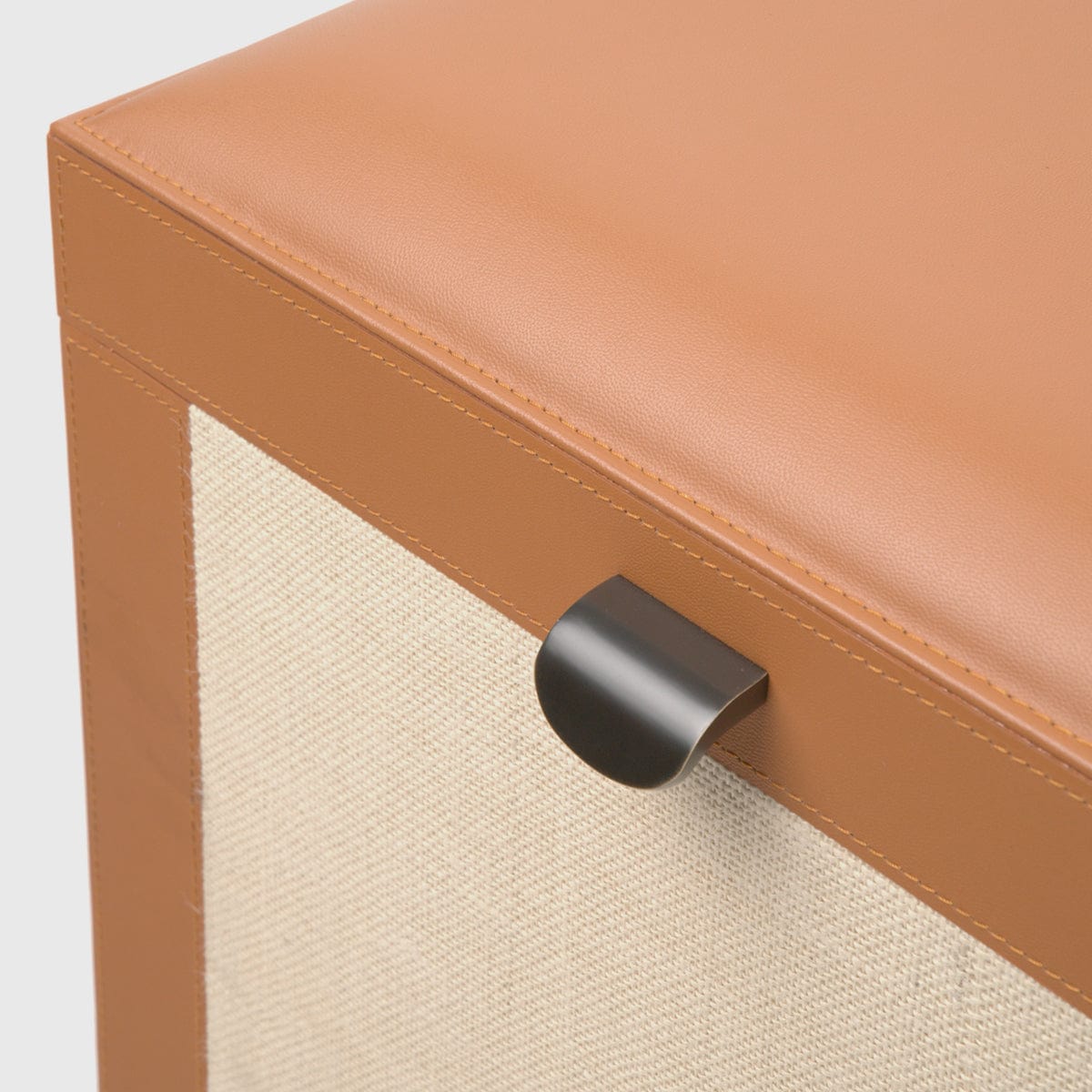 From the moment you lay eyes on the Ralf Ottoman Leather and Jute, its understated beauty commands attention. The natural jute exterior exudes warmth and texture, adding a touch of organic charm to any space. Complemented by the rich tones of the tan leather edges, the ottoman exudes a sense of rustic refinement that is both inviting and stylish. The bronze handle, meticulously crafted and thoughtfully placed, serves as a striking accent, elevating the ottoman to a new level of sophistication.