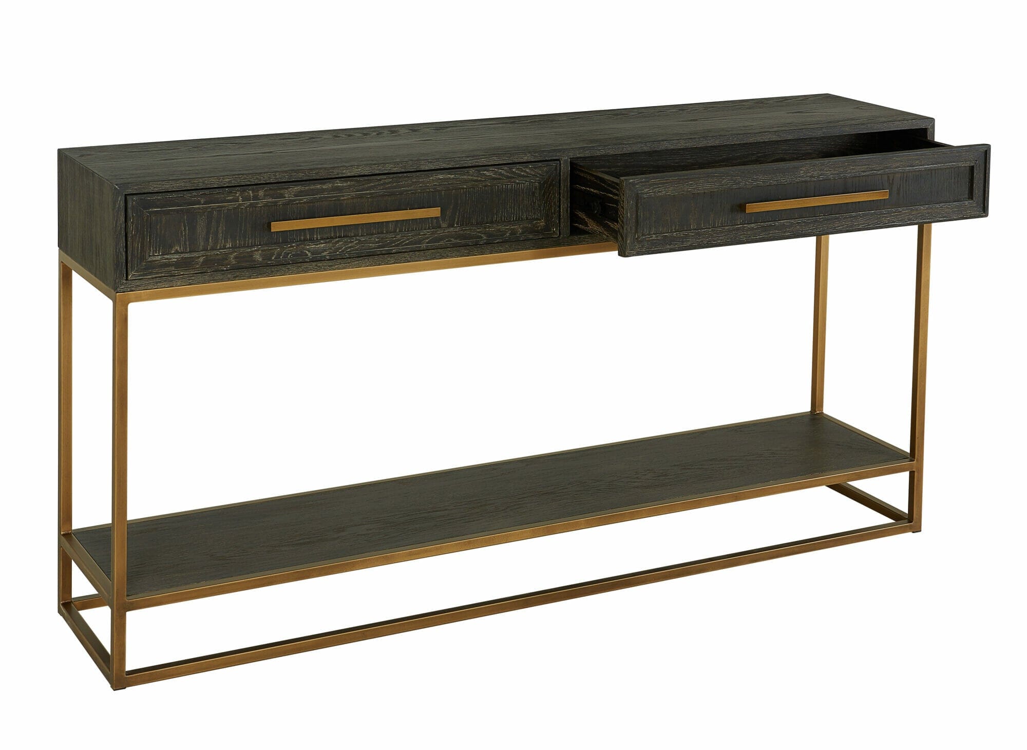 The Renmin Console table carbon oak is a truly unique piece of furniture that seamlessly suits both contemporary and traditional interiors. Its textured oak wood is finished in a warm and dramatic carbon color, while the metal gilt details and handles add a discreet touch of elegance. With two spacious drawers and a lower shelf, this console provides ample space to display lamps, art, and accessories, allowing your personal style to shine through. Measuring 160cm in length, it also offers plenty of room to display a mirror or original artwork above. Combine it with other items from the Renmin collection for a cohesive and luxurious look.