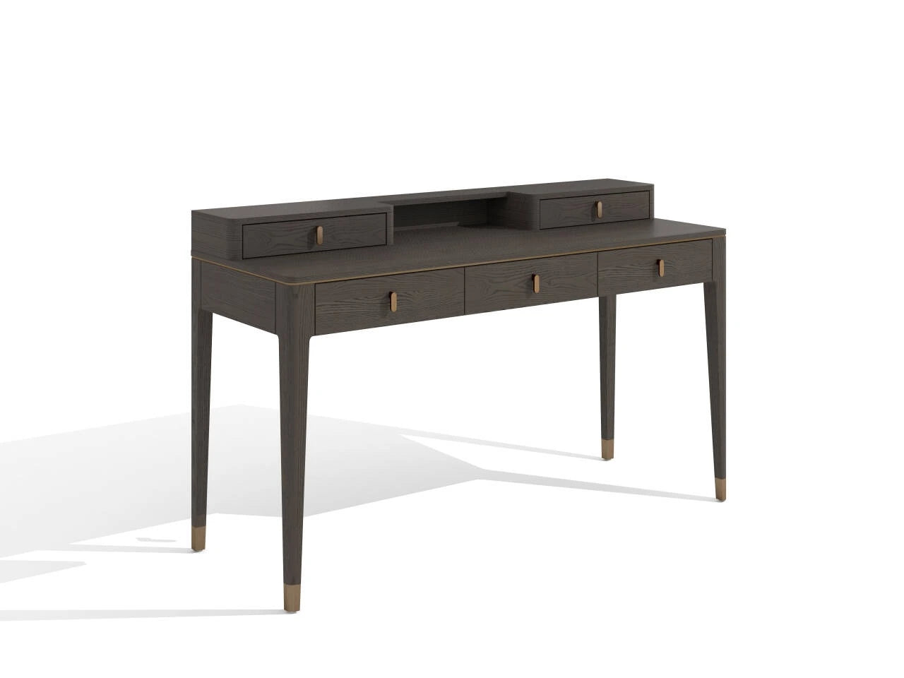The Studio Desk With 5 Drawers in Macchiato brings refined elegance and organization to any workspace. This luxury studio desk combines a rich macchiato oak finish with five thoughtfully arranged drawers, creating a seamless balance of style and function. Sophisticated Workspace: Studio Desk With 5 Drawers in Macchiato Crafted for modern living, the Studio Desk With 5 Drawers in Macchiato measures 140×52×88 cm, providing a generous desktop in a streamlined footprint. Its deep macchiato oak veneer exudes warmth and depth, making it an ideal focal point in home offices, creative studios, or executive suites. As a luxury studio desk , it elevates productivity with its refined silhouette and premium materials. Exceptional Storage & Organization The Studio Desk With 5 Drawers in Macchiato features a versatile storage layout: three full-width lower drawers accommodate larger files or supplies, while two slim upper drawers offer easy access to pens, notebooks, and devices. Each drawer glides smoothly on concealed runners, ensuring silent operation and preserving the desk's uncluttered surface - essential for any designer studio desk . The internal drawer panels are finished in matching oak, and the minimalistic pulls blend seamlessly into the design, avoiding visual distraction. Premium Materials & Subtle Accents At the heart of this designer studio desk lies its meticulously selected oak veneer, treated with a durable matte finish to highlight the natural grain. The desk's slender legs are capped with dark metallic socks that provide both stability and a refined contrast. A matching metallic interline along the desktop edge adds a modern flourish, reaffirming its status as a luxury studio desk . Key Features 140×52×88 cm dimensions - ample workspace without bulk Five drawers: three lower for larger items, two upper for essentials Exquisite macchiato oak veneer - warm, deep, and durable Dark metallic socks on legs and interline trim - elegant detailing Concealed runners for smooth, silent drawer operation Care & Customization Maintain your Studio Desk With 5 Drawers in Macchiato by wiping the surface with a soft, damp cloth and drying immediately. Avoid harsh chemicals to preserve the matte finish. For bespoke requests - alternative veneers, custom dimensions, or unique hardware - our workshop is prepared to tailor your designer studio desk to exact specifications. Please enquire for personalized assistance.