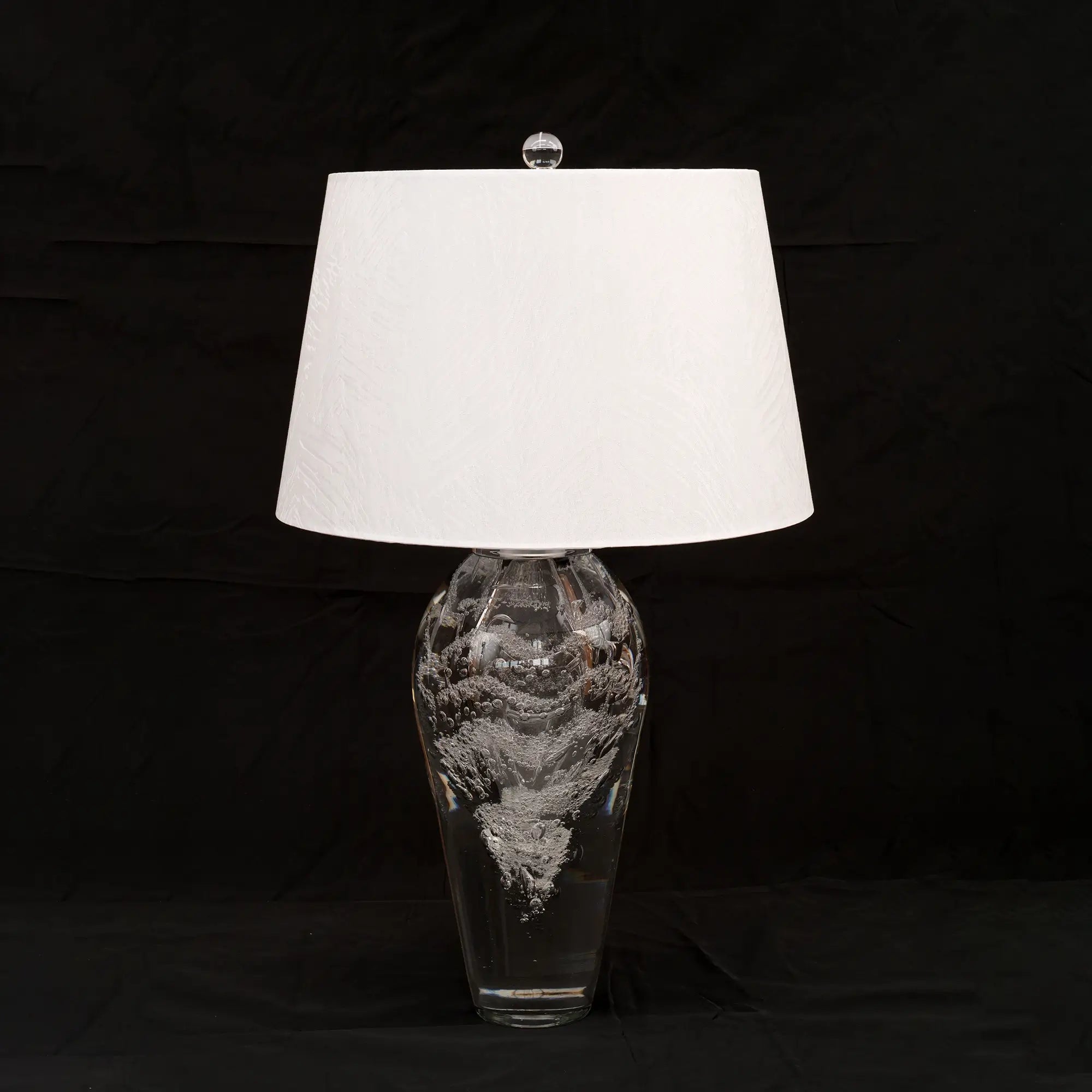 Timeless Glass Base & Modern Silhouette At the heart of the Studio Lamp Glass MAY02BL083 lies its hand-blown glass base, fashioned into clean lines and gently rounded contours that catch and refract light. The transparent body showcases subtle variations in thickness - an homage to traditional glassmaking - while its geometric profile ensures a sleek, modern silhouette. Whether positioned on a bedside table, console, or workspace, the lamp's glass form creates a sense of weightlessness and visual intrigue. Warm Ambiance with Signature Fabric Shade Complementing the luminous glass base is a premium fabric shade, selected for its fine weave and neutral tone. When illuminated, the shade diffuses light into a soft, welcoming glow, perfect for creating an intimate atmosphere in bedrooms, living rooms, or refined office settings. The shade's 67 cm overall height (including shade) ensures ideal proportions - providing sufficient illumination without overwhelming the space. Key Features & Specifications Dimensions: 16 × 10 × 36 cm (lamp height without shade); total height 67 cm with shade Material: Hand-blown glass base with subtle artisanal texture Shade: High-quality fabric, ivory hue for warm light diffusion Design: Contemporary form suitable for modern and transitional decor Bulb: Compatible with E26/E27 LED or incandescent bulbs (not included) Usage: Ideal as a bedside lamp, living room accent, or office desk light Versatile Styling & Placement The Studio Lamp Glass MAY02BL083 is as adaptable as it is elegant. Pair it with minimalist furnishings for a clean, airy look, or juxtapose it against richly textured surfaces—such as wood, marble, or leather - to highlight its luminous quality. Its transparent base allows displays behind it to remain visible, making it an excellent choice for crowded shelves or slim consoles. As a designer luxury lamp , it promises to be a focal point that complements art, accessories, and architectural features alike. Installation is straightforward: simply place the lamp on any stable surface, fit your chosen bulb, and connect to a standard outlet. A discreet inline switch ensures ease of use, while the sturdy base guarantees stability. With minimal maintenance - just occasional dusting of the glass and shade - the Studio Lamp Glass MAY02BL083 will continue to shine brightly in your space for years to come.