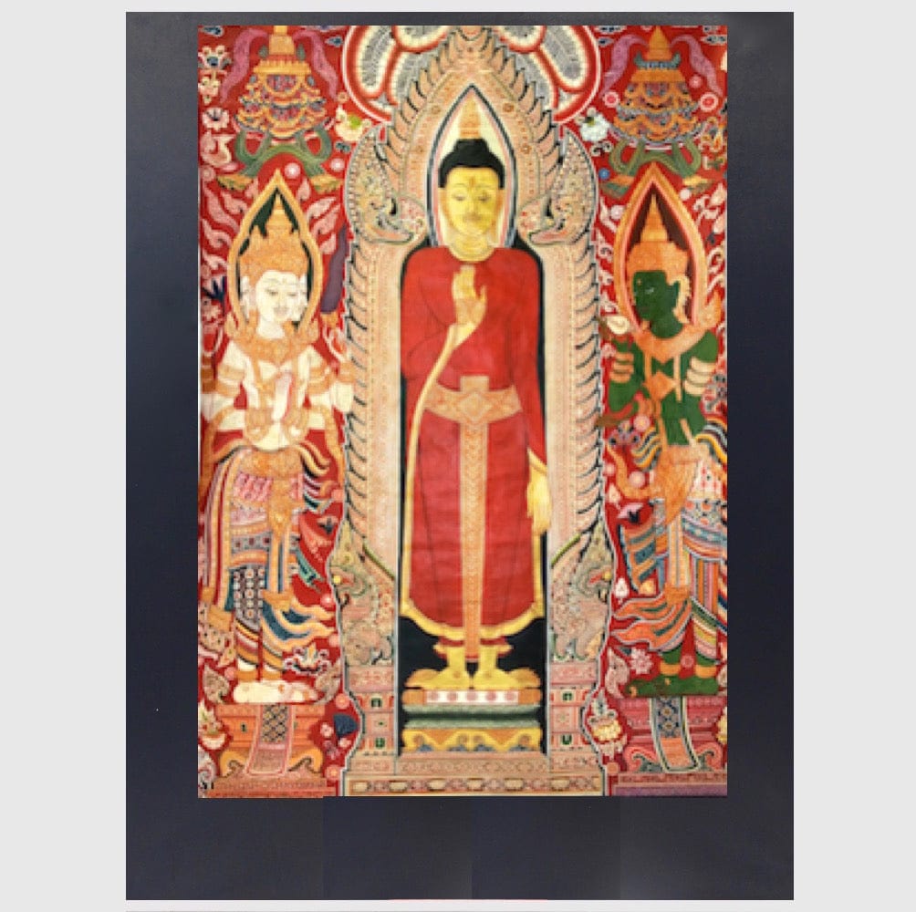 Introducing the Temple Painting, a one-of-a-kind masterpiece that will elevate your space to new heights. This artwork is completely original, making it a truly unique addition to any home. With intricate details and the use of 24K gold leaf, this painting is reminiscent of traditional temple art. The artist behind this piece has a background in restoring the royal palace in Bangkok, making this a truly special creation.