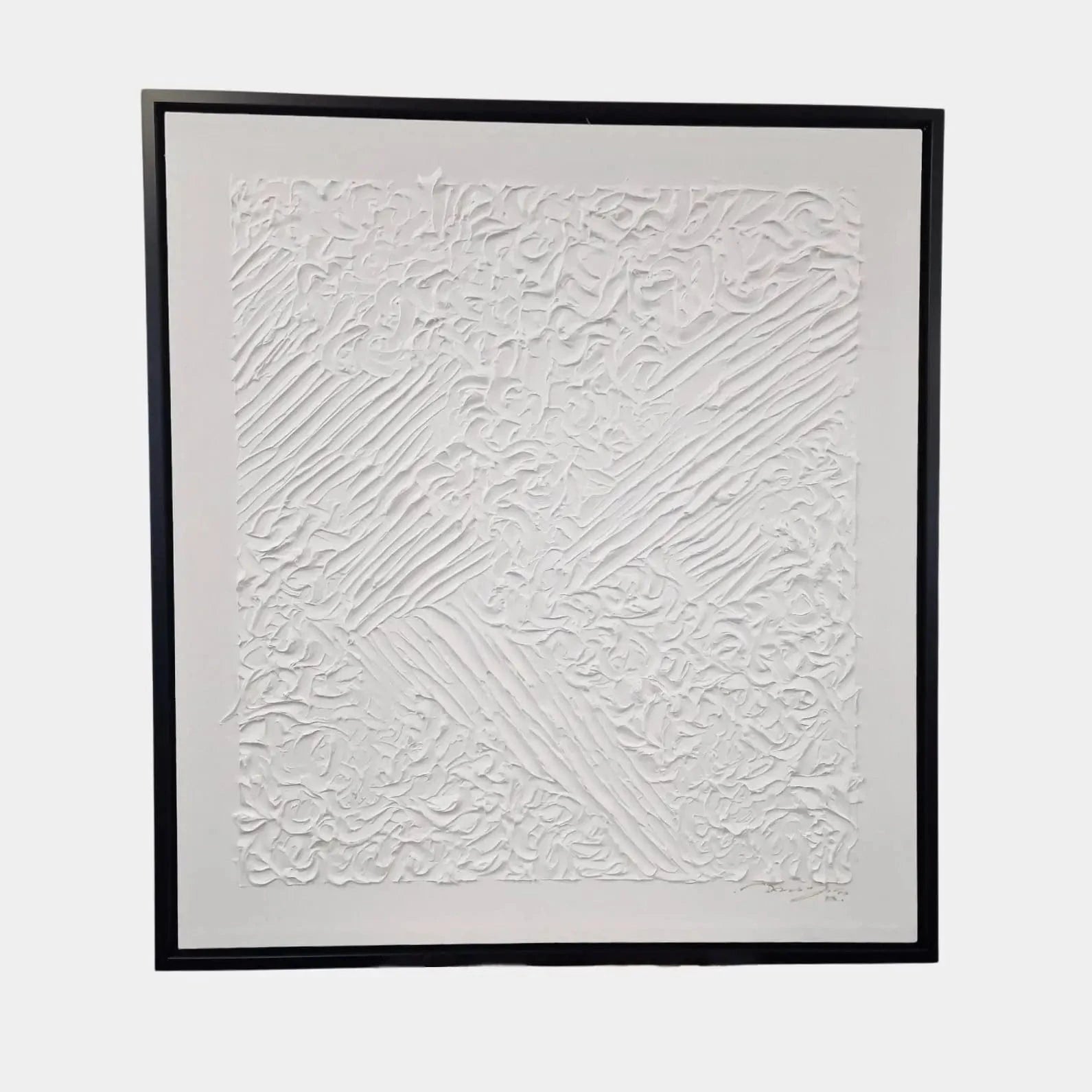 The White 3D Abstract Painting Large - 3 is a stunning display of heavily textured technique, rendered in pure white with graphic shapes. The black frame provides a sharp contrast, making it a captivating focal point in any interior. Measuring 107cm x 117cm, this painting is the perfect size to create impact and drama in your space. We believe that art is not just a visual experience, but also an emotional one, and this original artwork is sure to evoke powerful emotions in anyone who experiences it.