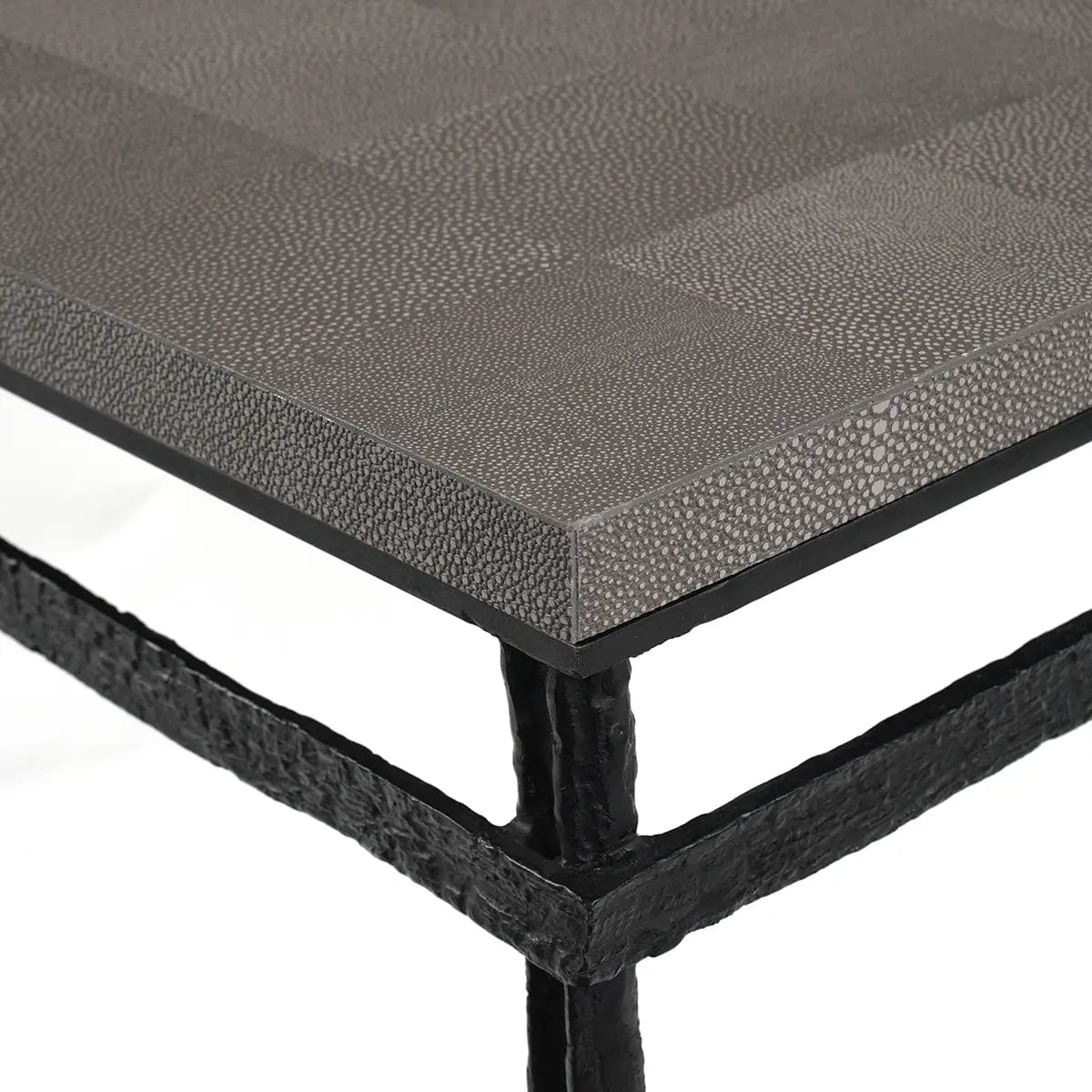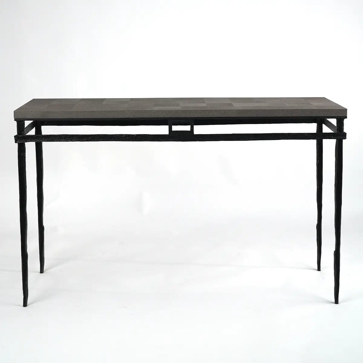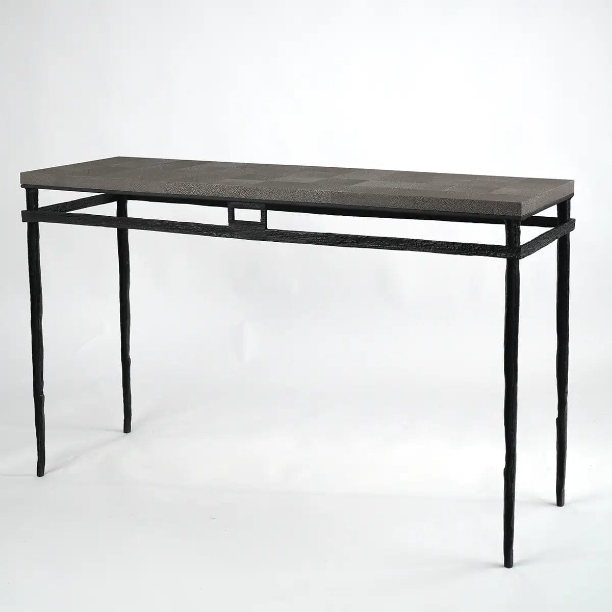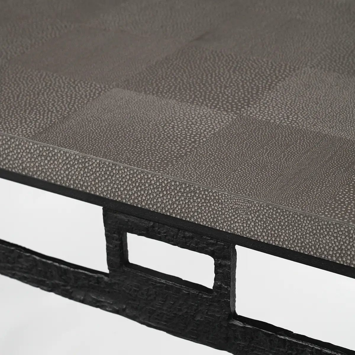 Introducing the Wode Console Bronze Nera Grey Shagreen Leather, a truly unique and luxurious addition to any interior. This console features a base hand cast and finished in bronze nera, creating a bold and timeless appeal. The table is shown here in our exclusive grey shagreen leather finish, providing a touch of elegance and sophistication. Created by Eccotrading Design London, this designer leather bronze console is a fusion of modern glamour and style, perfect for any modern, classic, or contemporary space.