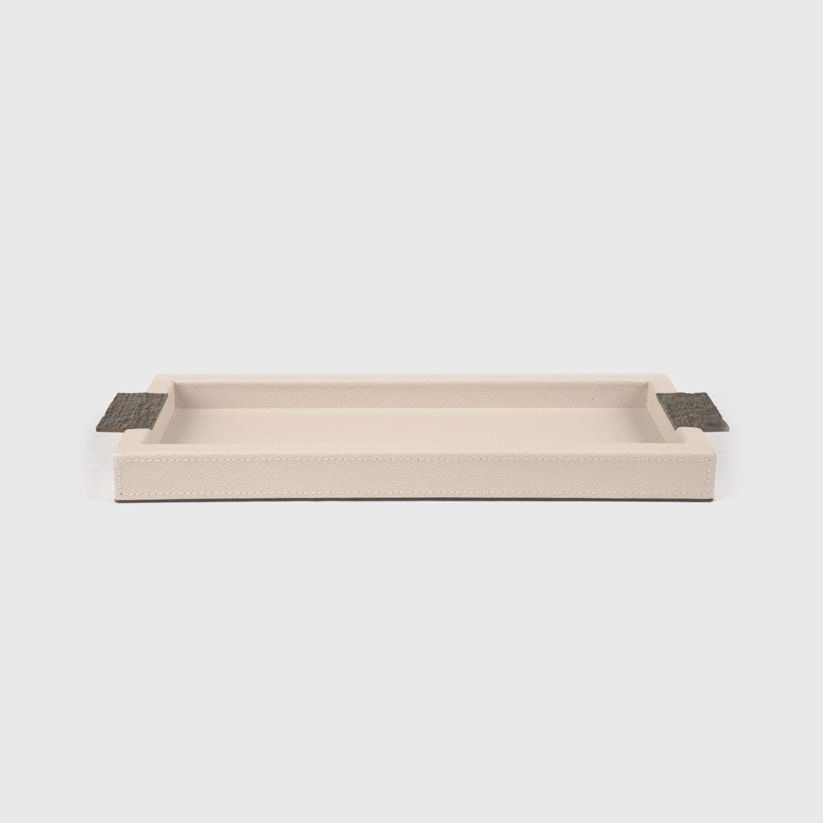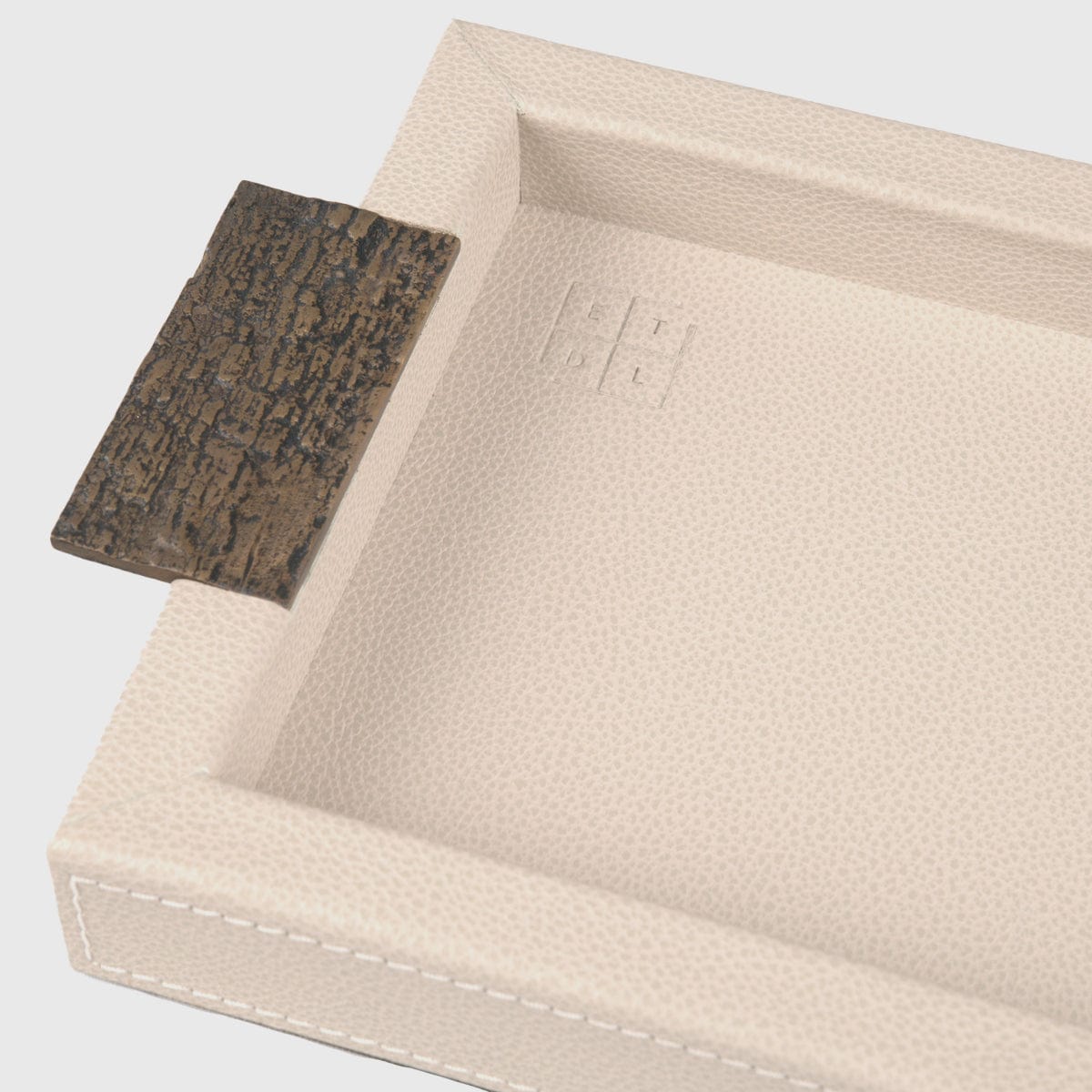 Introducing the Wode Tray Rectangle Pumice Leather 47cm, a unique and luxurious addition to our Original Leather Accessory Collection. This exclusive tray is covered in opulent leather and features elegant hand cast bronze handles, adding a touch of drama, luxury, and originality to any interior. Available in a selection of sizes and leather choices, each tray is lined with black piquet for added quality. Made by Eccotrading Design London, this designer tray is just one of many wonderful items perfect for display and use. Unlike furniture made with PU, leather can be easily cleaned and maintained, and will develop a beautiful patina over time. Complete your coffee table display with one of our original and exclusive leather boxes. Dimensions: 47 x 18 x 3cm h. Finish: Leather Pumice.