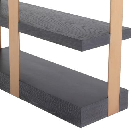 Give your books, plants and home accessories a home in the contemporary Geo Cabinet. This stylish and practical storage unit matches all modern décor styles and is useful in any room. Its sturdy metal frame has a brushed brass finish and contains 6 shelves in charcoal grey crown oak veneer.