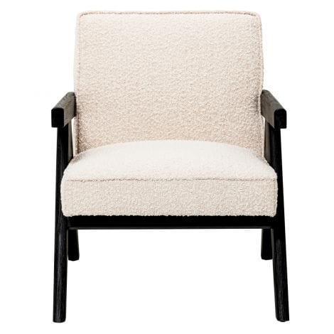 Chair Greta pairs a vintage look with ultimate seating comfort. Crafted from solid wood with a black finish, this beautiful armchair features the V-shaped legs that are characteristic of celebrated minimalist designs from the 1950s and 1960s. The seat, backrest and distinguished armrests are upholstered in cream-coloured bouclé and finished with piping.
