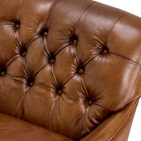 Cosy and inviting, the Caledonian Club Chair will be the favourite seat in your lounge or study. This button-back tobacco leather upholstery with elegant rolling arm and back, antique brass stud detailing and turned dark wood front legs with casters, offers a wonderful sink-in experience.