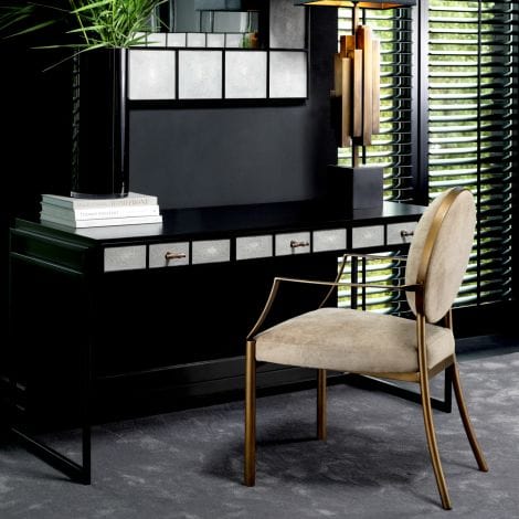 Delve into the vintage style of the Scribe Dining Chair with arms. Inspired by the art deco furniture created in the roaring 1920s, this metal dining chair with matte gold finish and greige velvet upholstery is equally at home in classic décors as in mid-20th century and contemporary interior schemes.