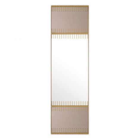 More than just a mirror, the Presidio Mirror is a piece of wall art. The sleek frame has a brushed brass finish and is divided in three parts. The upper and lower part contain smoked mirror glass, while the central part holds a mirror. Fringe-like accents overlap each piece, adding a sense of drama.