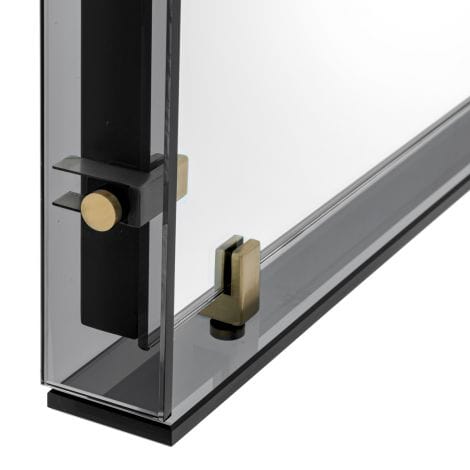 Sleek and sophisticated, the large Verona Mirror exemplifies contemporary style with a silhouette made of mixed materials arranged into a distinctive form. The rectangular smoked glass frame features antique brass accents that gleam in the soft light as they extend from the frame to uphold the mirror.