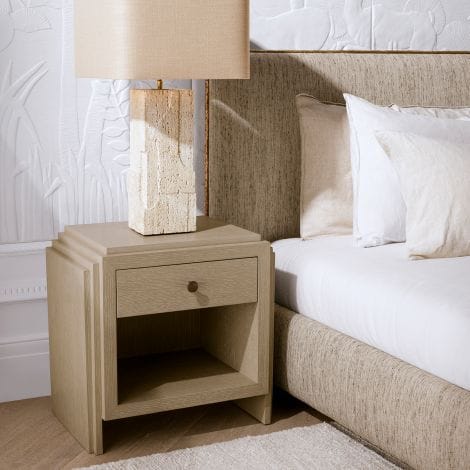Elevate your interior with the Nightstand ArtDeco, showcasing washed oak veneer softened by bronze accents. Its refined geometry and subtle shape evoke the glamour of Art Deco elegance, creating a sophisticated balance between natural warmth and metallic sheen. This piece embodies timeless luxury through thoughtful material interplay.