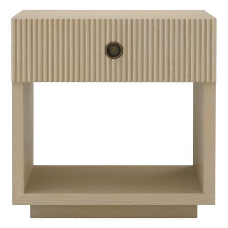Elevate your living space with the Dimitrios Nightstand, featuring a striking washed oak veneer. Its ribbed wooden panels and bronze-finished accents create a stunning visual contrast, harmonizing elegance and function. Perfect as a nightstand or side table, its luxurious aura complements any sophisticated interior, captivating the discerning connoisseur of modern design.