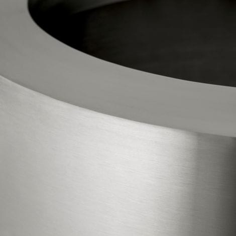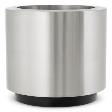 The Planter Jasper round S features a sleek brushed steel finish paired with a sturdy black base, combining modern design with durability. Its minimalist round shape adds a refined touch, making it a stylish and lasting metal planter in silver tones.