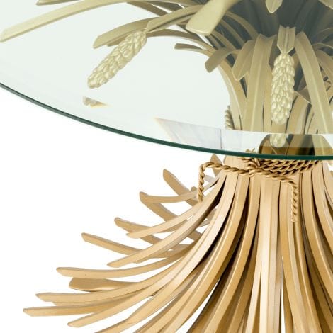 Sculpted from iron in an antique gold finish, the dazzling Bonheur Side Table ø 90 cm includes a sheaf-shaped base and a bevelled clear glass tabletop. Originally a symbol of prosperity and hospitality, the sheaf signifies one has worked hard and is now enjoying the good life.