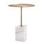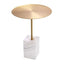 Side Table Cole is all about simplicity and natural appeal. The round brushed brass table top is embellished with raised edges. It sits on a sleek stem which firmly rests on a block of white marble with grey veins, giving it a chic and elegant look.