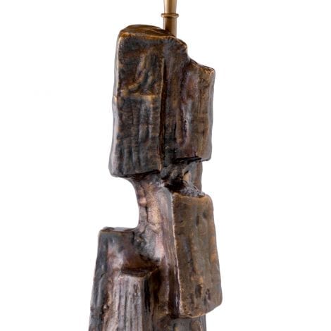 Inspired by Brutalist sculptures of the 1970s, the tall Noto Table Lamp is a piece of art on its own. The texture effect in the metalwork adds depth to the rocky, organic design. This impressive table lamp is finely crafted and provided with a vintage brass finish. Mounted on a black granite base, it has a velvety illusion black shade with a subtle relief.