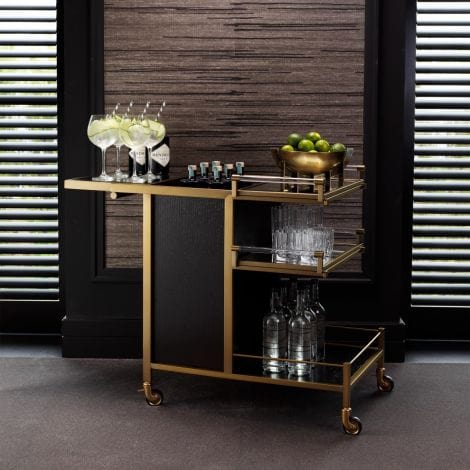 Make a splash with the brushed brass finish Eiffel Trolley. Your beautiful glassware and fancy gin bottles deserve to be shown off upon this must-have bar cart. With two detachable mirror glass serving trays and a black veneered cupboard, it offers ample space for display and storage. The cupboard has one shelf and is accessible from the frontside with doors. The top can be opened for access to a separate compartment for bottles.