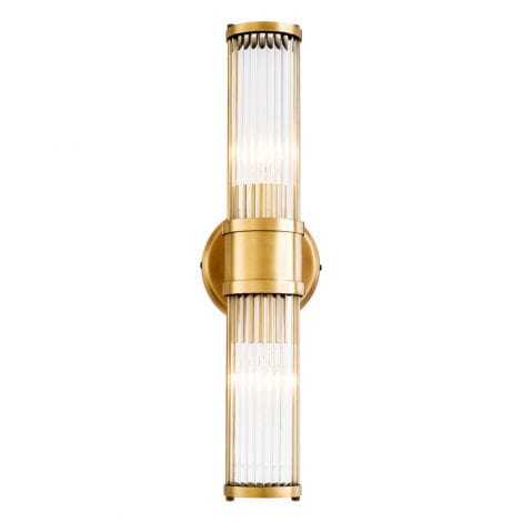Create a warm glow in your hallway, lounge or bedroom with the Claridges Double Wall Lamp. This alluring Art Deco inspired wall lamp features an antique brass finish and two lamp shades of ribbed and bevelled clear glass for added depth and glamour.