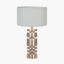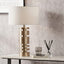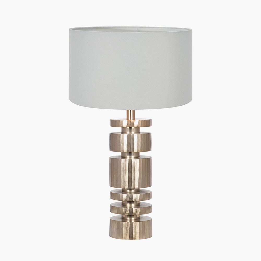 Statuesque and architectural! This metal table lamp boasts a soft champagne gold finish, accentuated by fine linear etchings on the metalwork. It is beautifully topped with an ivory cotton mix lamp shade, completing its sophisticated look.
