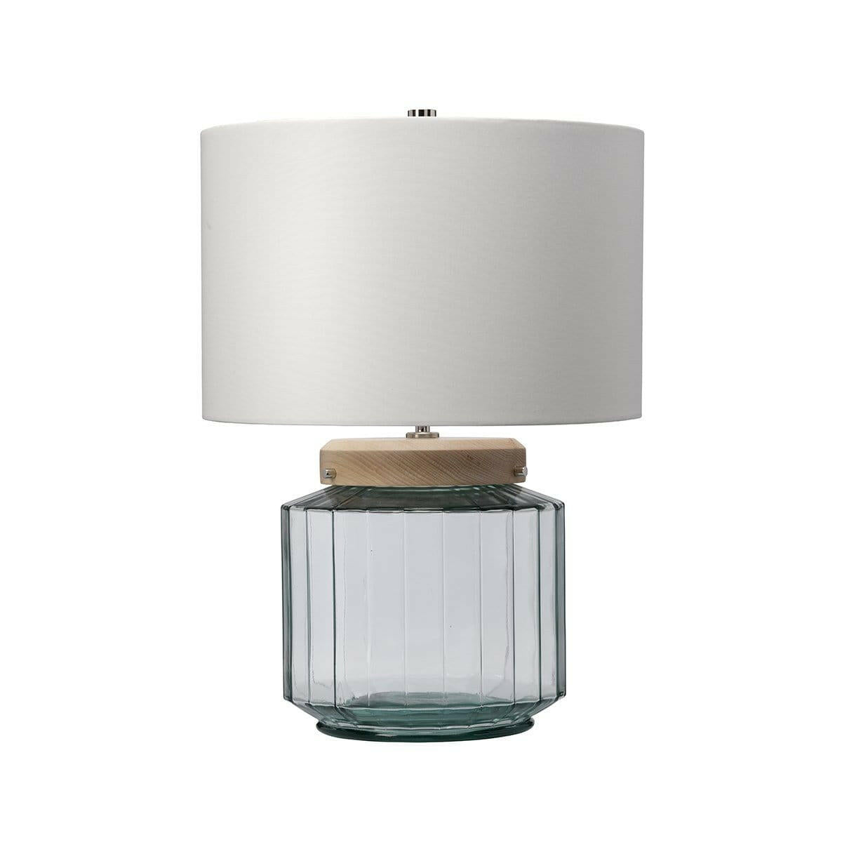 Luga’s distinct recycled glass base with its strong vertical lines casts a bold yet elegant visual appeal. Topped with its wooden cap and fine metal details, Luga balances contemporary style with a warmer earthier feel. It is complemented with a polycotton drum shade hand-crafted in the UK.