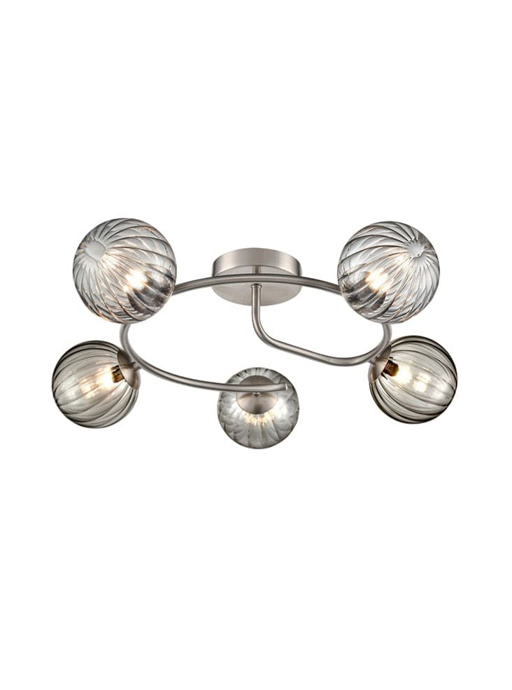 A five light flush fitting in satin nickel finish with smoked ribbed glass spheres.