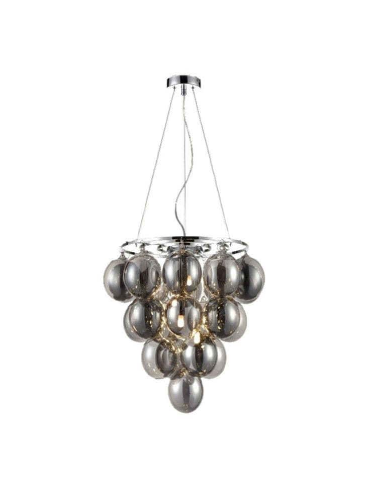 Chrome finish pendant with oval-shaped smoked glasses. The height of the pendant is adjustable prior to installation.