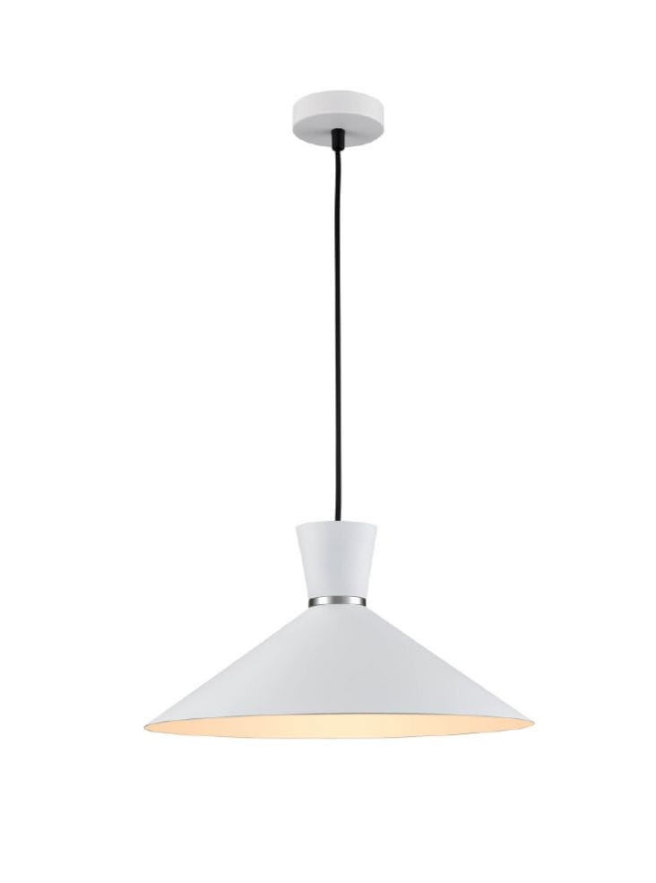 in satin white finish with a decorative chrome ring on a black braided cable suspension.