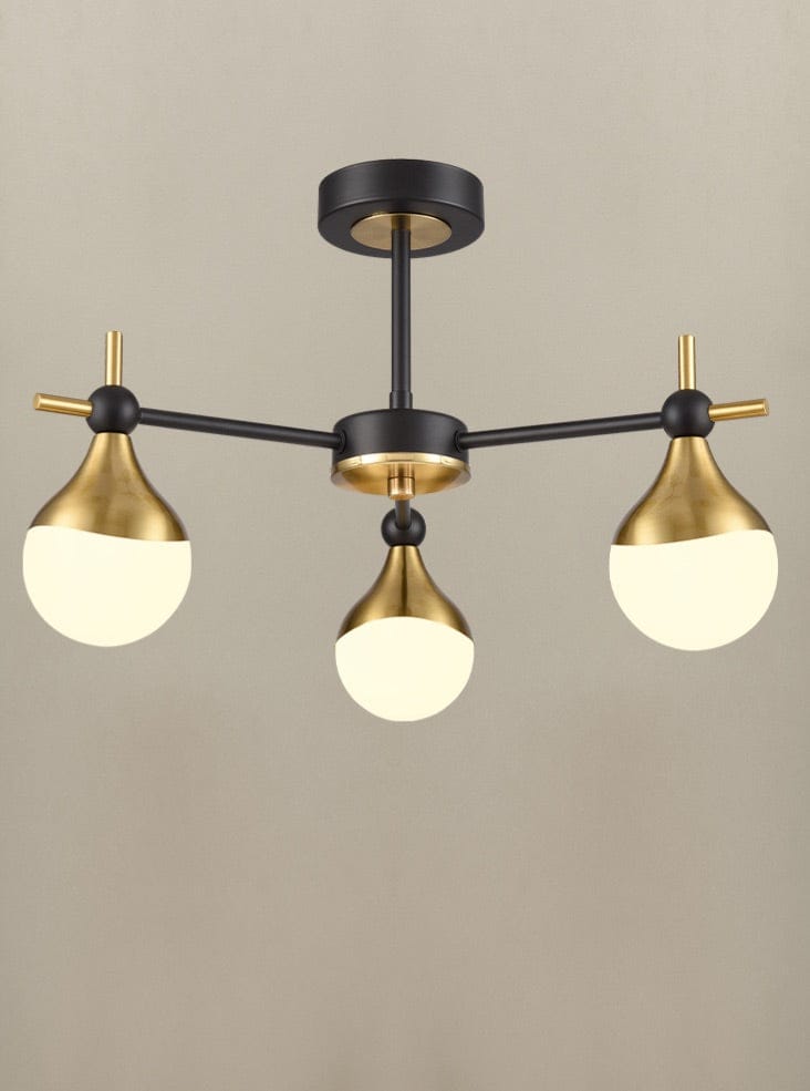 Matt black and aged brass finish 3lt semi flush with teardrop shaped opal glasses.