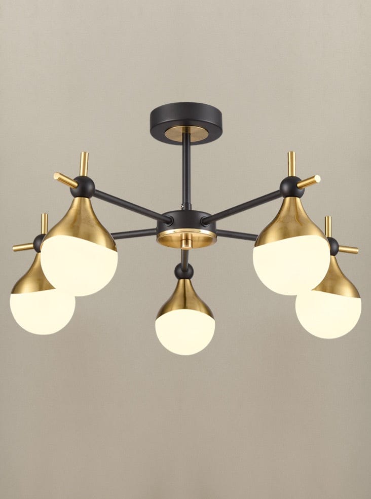 Matt black and aged brass finish 5lt semi flush with teardrop shaped opal glasses.