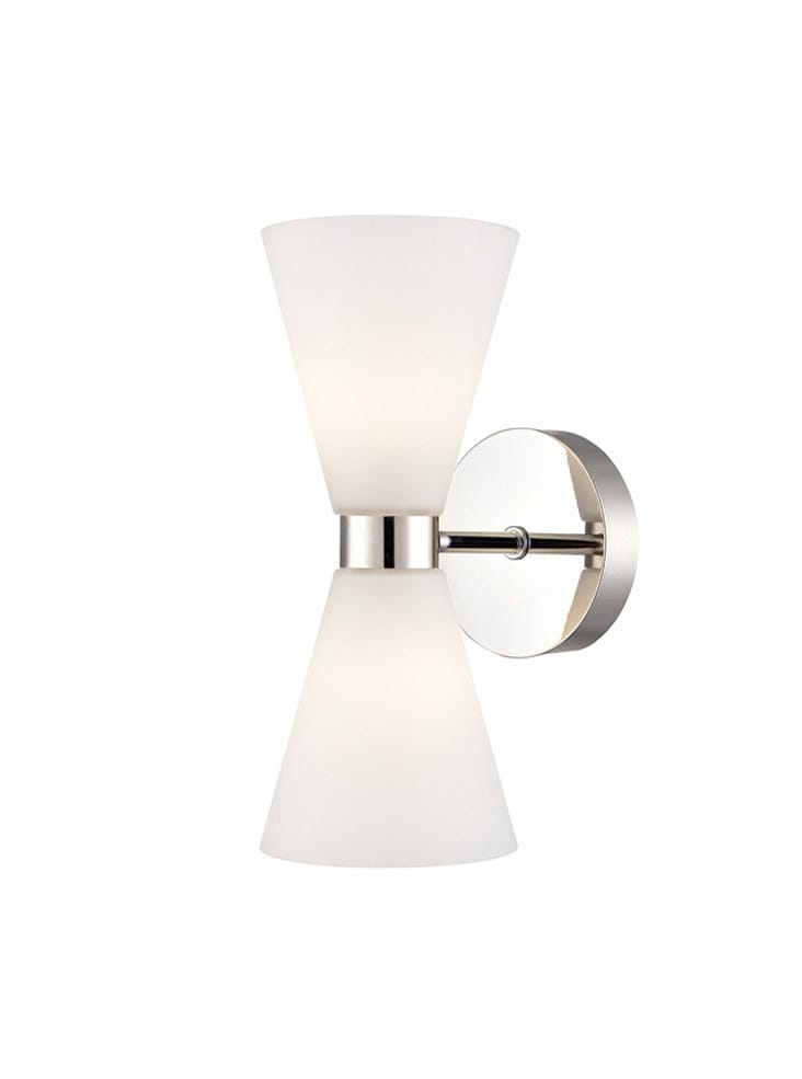Polished nickel finish bi-directional wall lights with matt opal conical glass shades. Rated IP44.