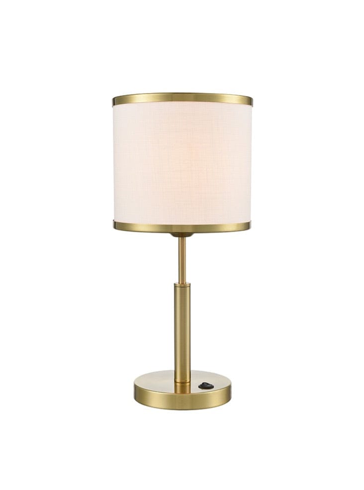 A aged brass finish table lamp with off-white textured fabric shade featuring matching trims. This table lamp has a switch on the base.