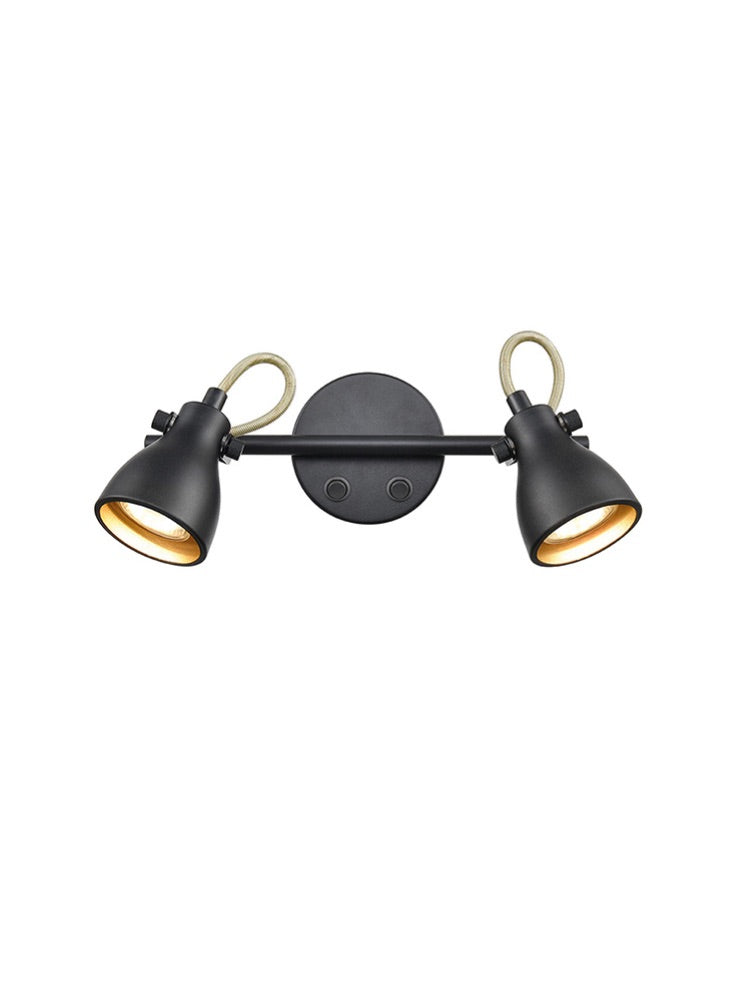 A dual lamp, wall mounted spotlight in matt black with decorative gold cable covers. The interior surface of each shade is finished in gold. There are two rocker switches on the mounting plate. The heads are fully adjustable.