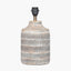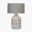 Crafted in India, this textured table lamp showcases a softly rustic charm with its hand-carved mango wood base featuring an organic stripe design, finished in a subtle grey wash. It is topped with a grey cotton mix lamp shade, completing the look perfectly.