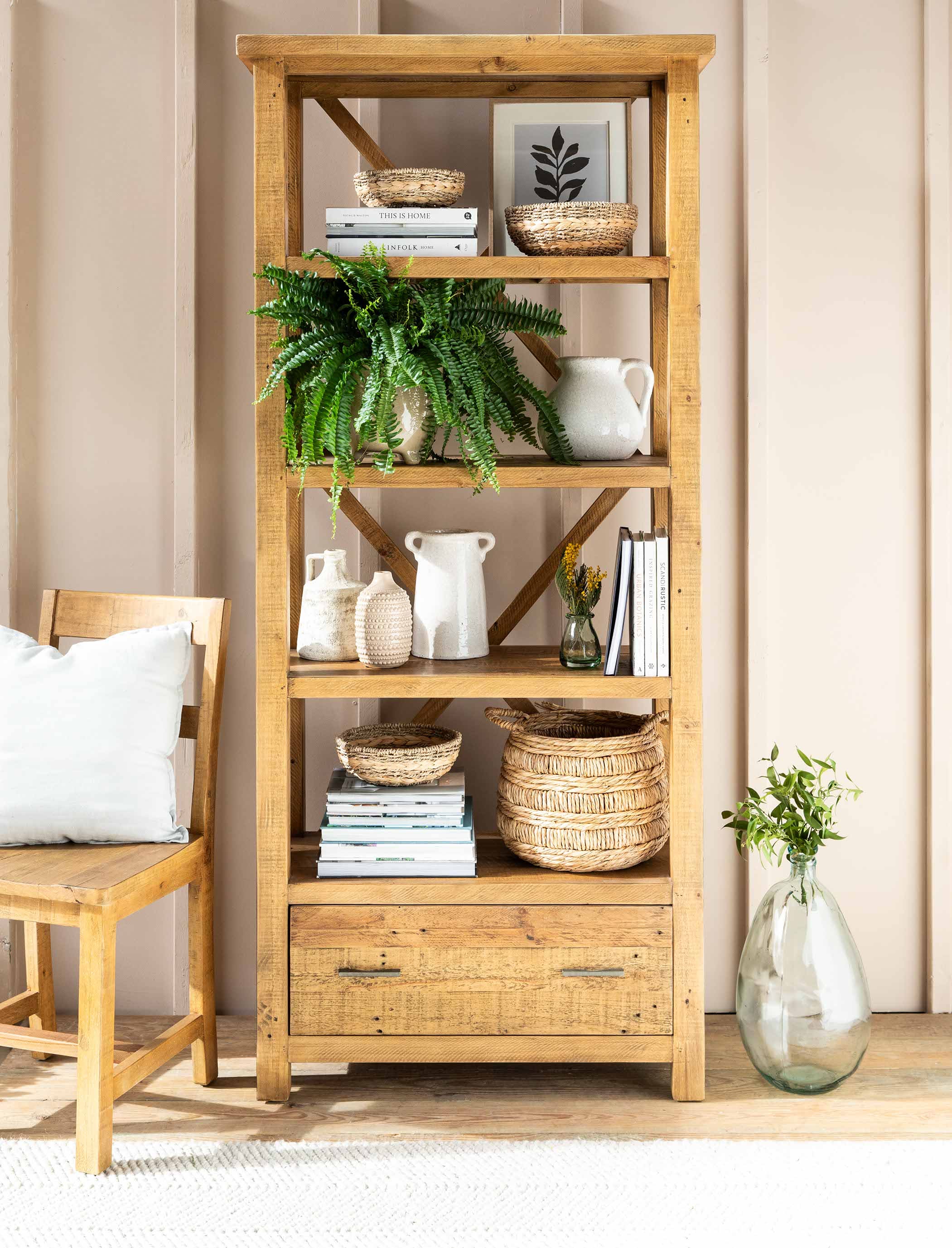 A beautiful place to display treasured volumes, our Ashwell Bookcase has four shelves ready and waiting to take books, house plants and other accessories to style a room. Perfect for living rooms and home offices, it also has two bottom drawers that make a handy storage space for small bits and bobs. Crafted from reclaimed pine with a light stain, the Ashwell Bookcase comes with an anti-tip kit to keep it safely upright. Complete the look by pairing it with other furniture from our Ashwell collection.