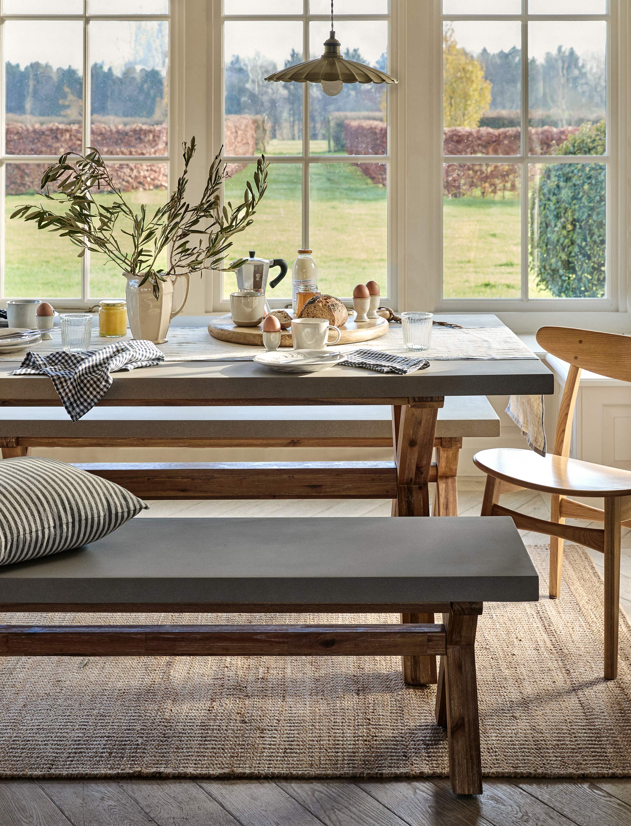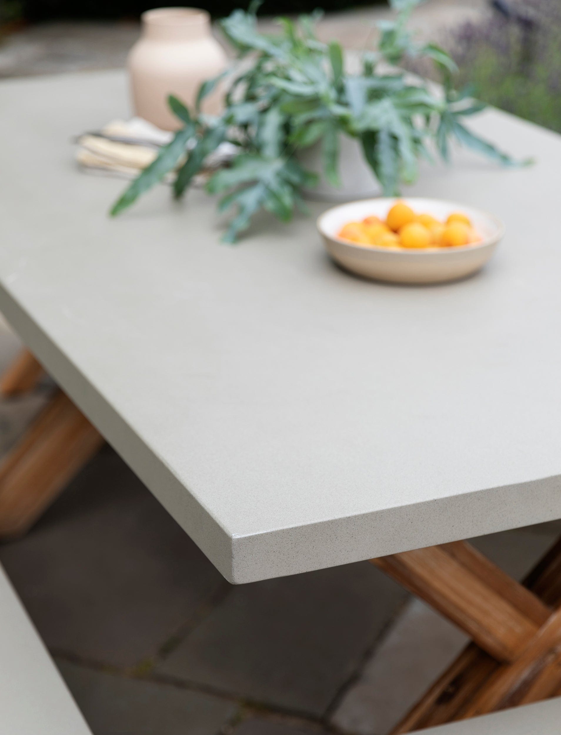 Turn a smaller patio into an intimate al fresco dining space with our Burford Table & Bench Set. This set features our small Burford Table and two matching Burford Benches ; everything needed to create an informal table setting ideal for family gatherings and summer barbecues. Crafted from solid acacia, and with a robust polystone table top, our Burford Table & Bench set is weatherproof enough to leave outdoors all year round. However, wed recommend a protective covering to keep them in great condition through sharp frosts and other wintry weather.