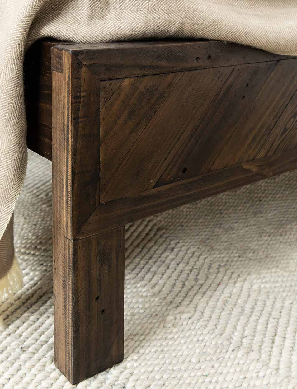 Our fabulous Fawley Chevron Bed helps create a bedroom fit for a king. This decadent king-size bed is crafted from solid reclaimed pine in Antique Brown, along with solid wood slats to hold any mattress of your choice. Transforming it into a work of art, the striking wooden chevron headboard makes it a real focal point. The Fawley Chevron Bed only comes in king size, ready to make a statement, and makes the ideal starting point for an exquisitely styled bedroom. Pairing perfectly with other Antique Brown bedroom furniture in our Fawley range, all it needs is beautiful bed linen from our Pembride range and our Fawley Bedside Tables to complete the bedroom makeover.