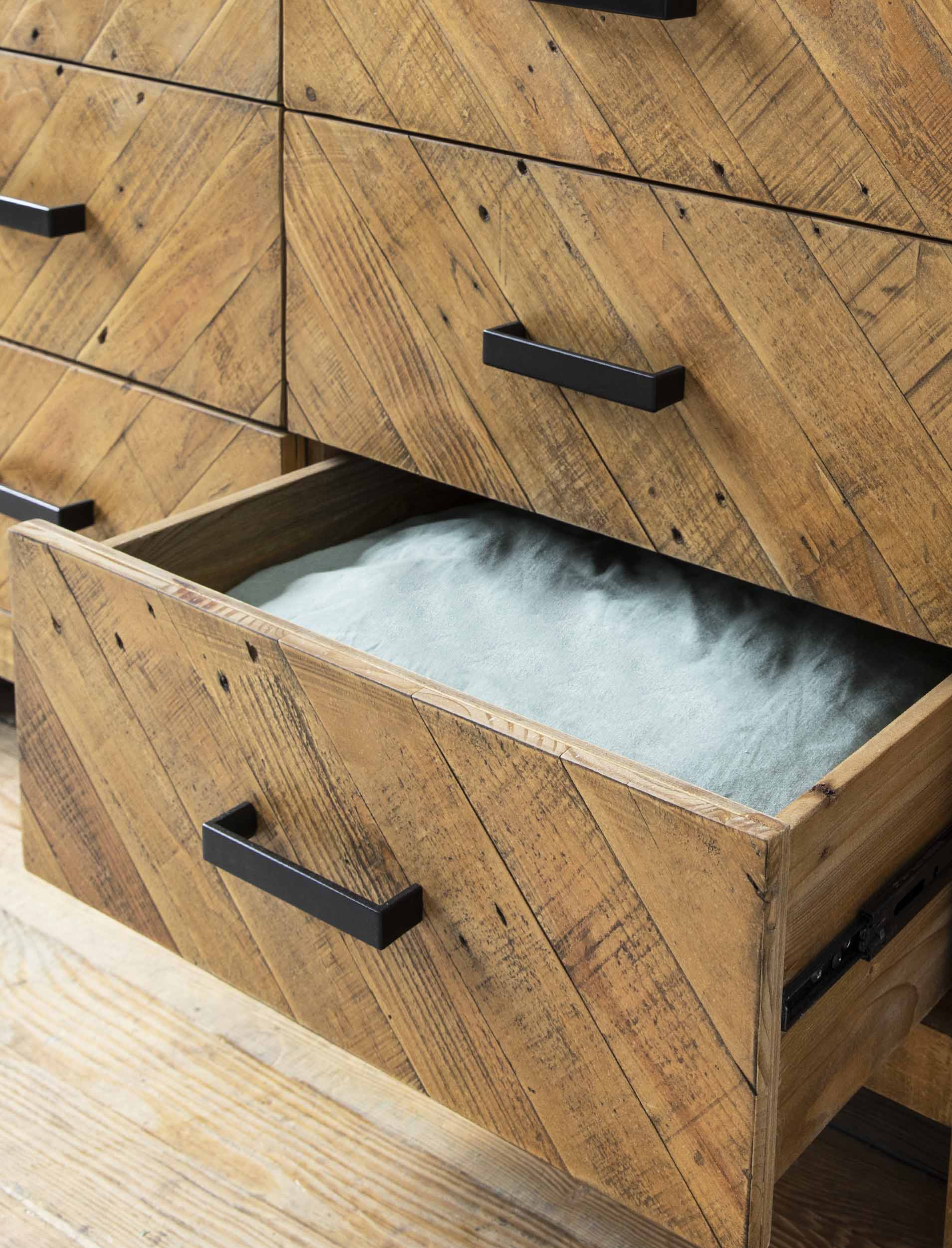 Give a bedroom a sophisticated makeover with our Fawley Chevron Chest of Drawers and other furniture from our fabulous Fawley range. Crafted from reclaimed pine, this striking chest of drawers features the same chevron design as the matching bed and bedside tables. This chest of drawers has six drawers of equal size, providing plenty of space to keep clothes neatly organised. Beyond the bedroom, it also doubles up as an ideal dining room or living room sideboard, or as a stylish storage unit in a hallway or boot room.