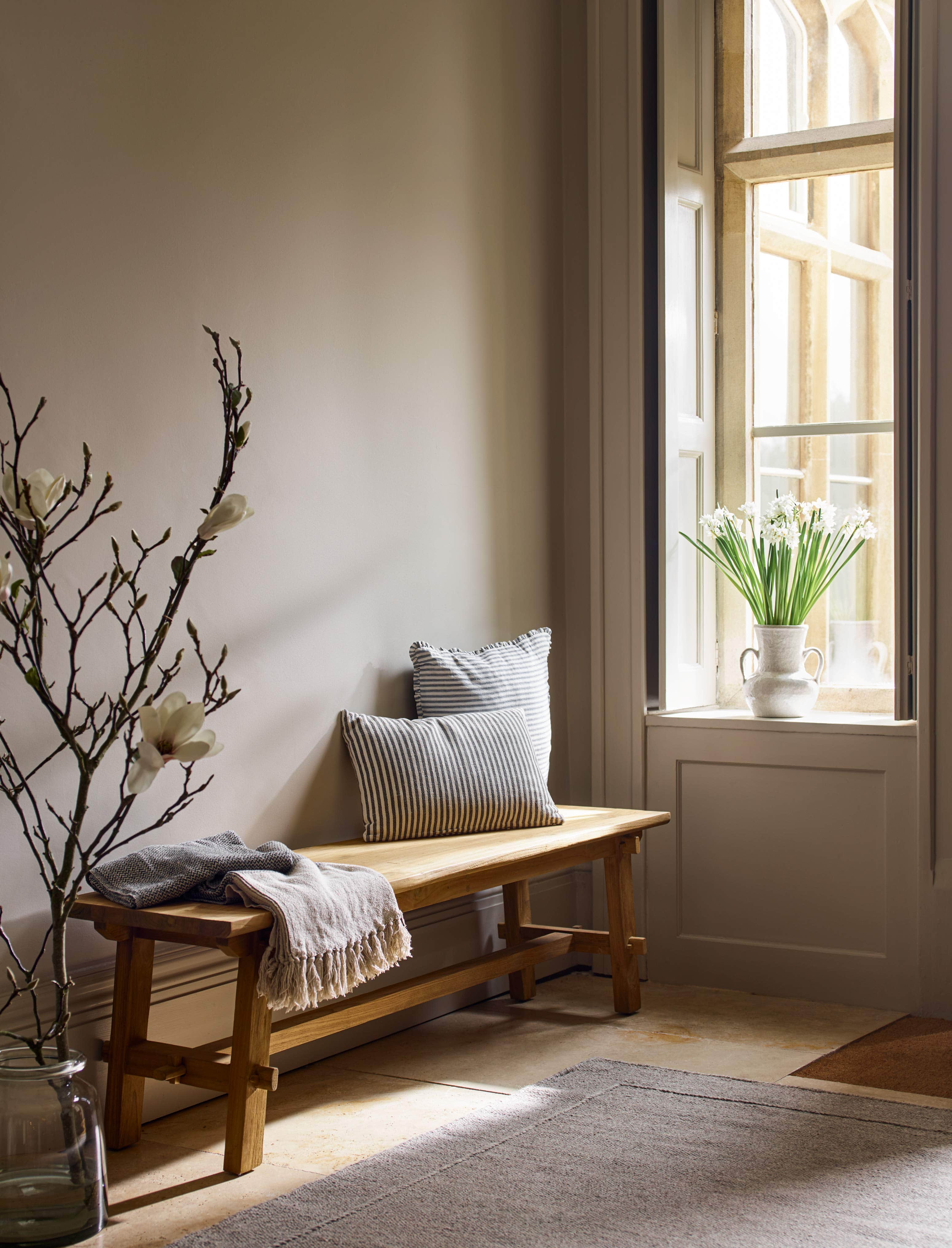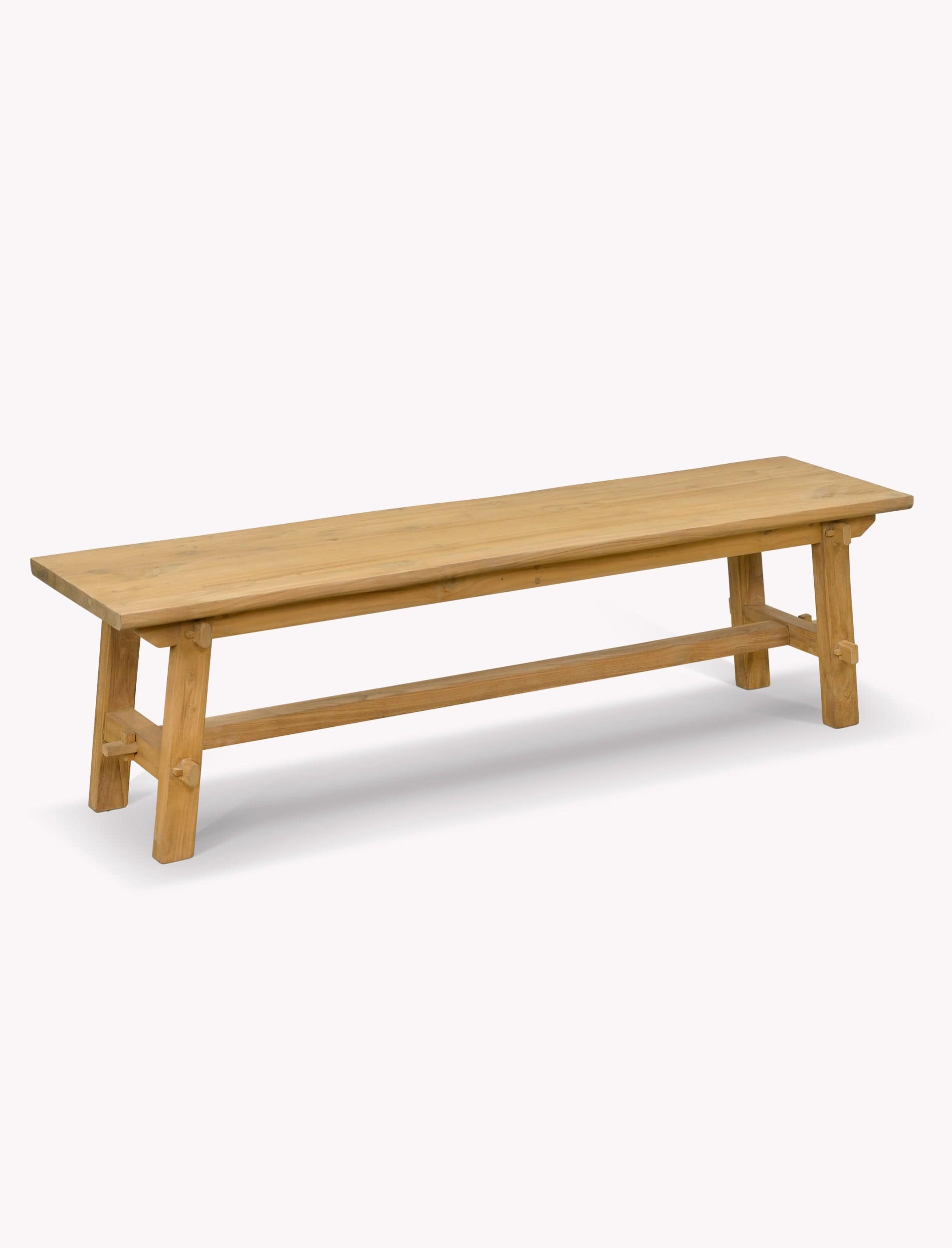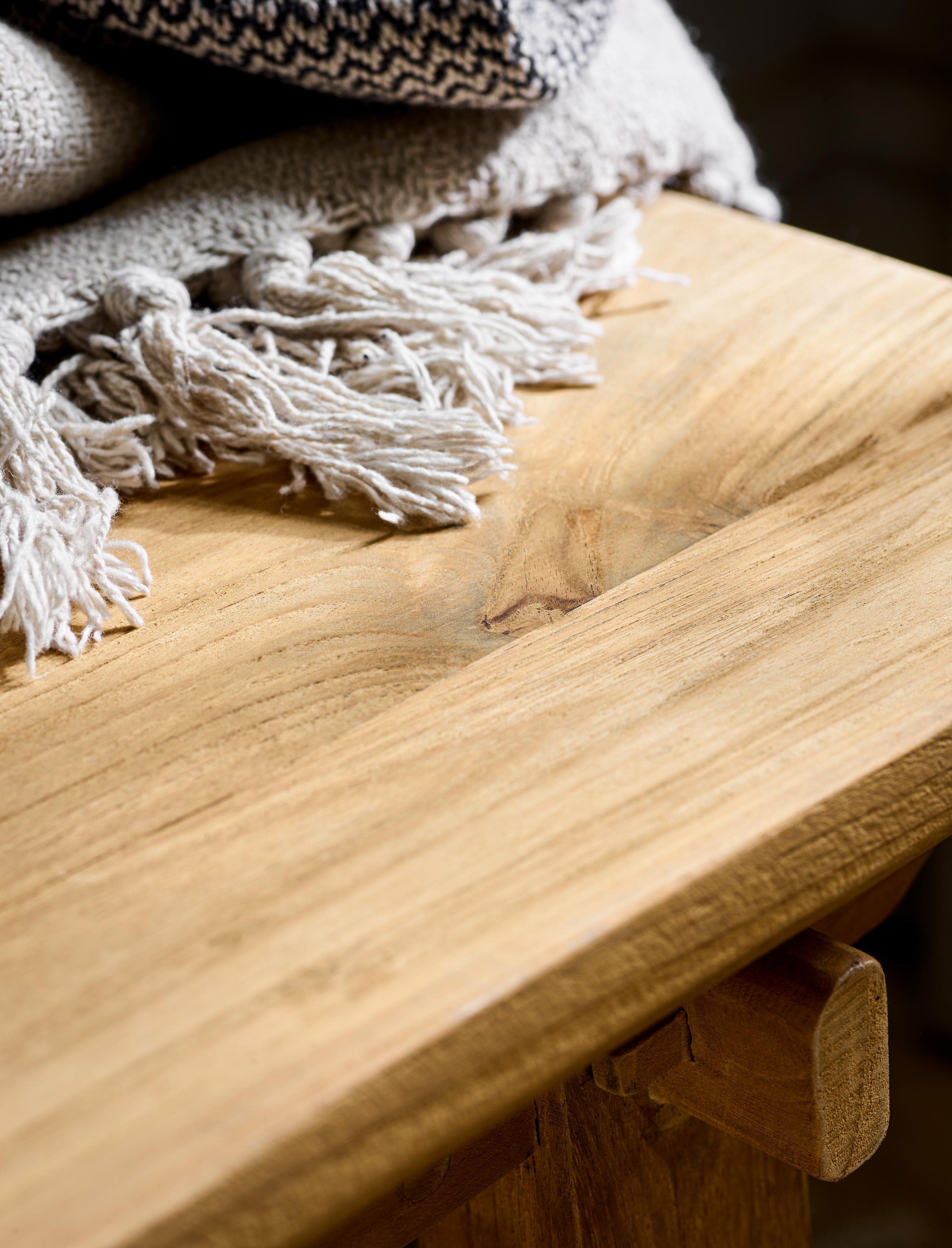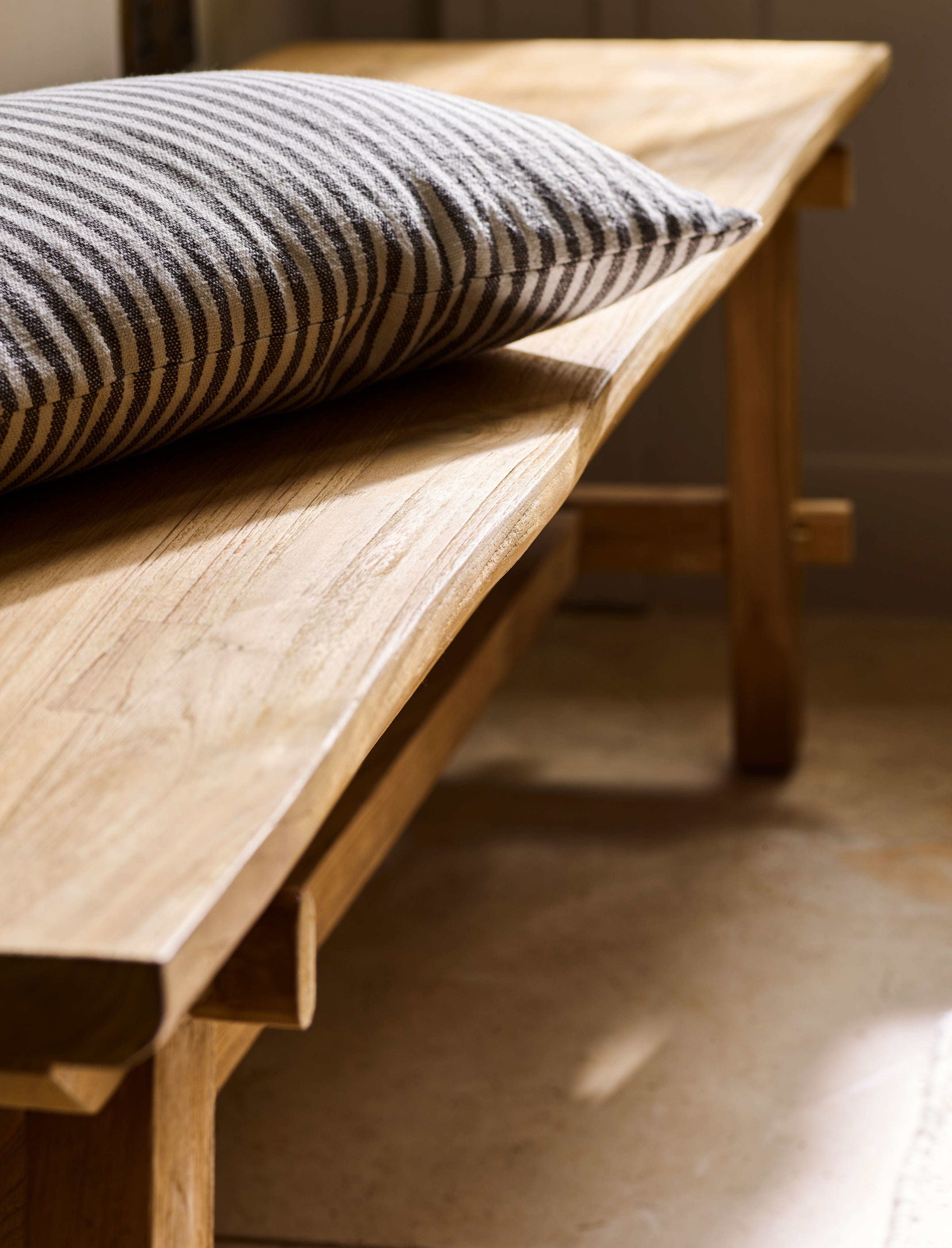 One of our finest, the Hanborough Bench is a true piece of craftsmanship that will sit well in country homes and townhouses in equal measure. Its homely trestle-style design has heaps of style, with the texture and grain of the wood taking centre stage thanks to its beautiful live edge detail along the top and visible joint detailing. This wonderful bench is made in Indonesia using recycled teak wood, and will pair perfectly with the matching Hanborough Dining Table. It would also work well as a hallway or bootroom bench, with room under it for lining up wellingtons and walking boots, or at the foot of a bed styled with cosy sheepskin rugs.