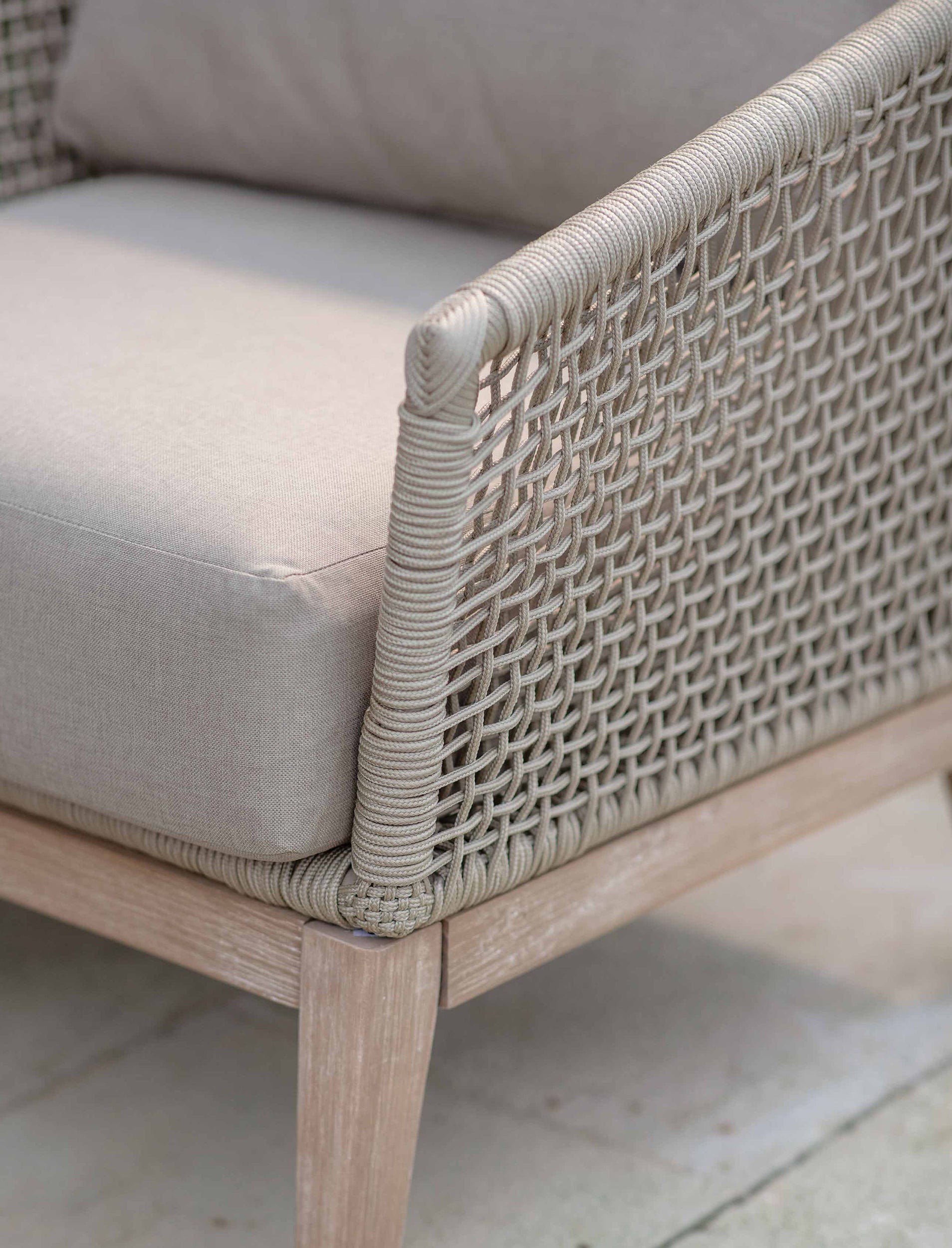 With everything you need for al fresco entertaining and relaxed weekends in the garden, our Lynton 3-Seater Sofa Set instantly transforms a patio or decking area. Featuring our Lynton 3-Seater Sofa, along with two Lynton Armchairs and a matching coffee table for refreshing drinks, it's a stylish and comfortable choice for outdoor living. Both the sofa and armchairs have comfy seat pads and luxuriously thick back cushions, making this the ultimate place to unwind on a sunny day. Crafted from weatherproof acacia wood and neatly woven rope, it can be matched with our Lynton Side Table for another place to perch drinks and nibbles or display a potted plant or two.
