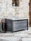 Introducing the Moreton Outdoor Storage Box - Large, the perfect addition to any garden. Crafted in Spruce and dip treated with a water based non-toxic stain, this storage box is not only durable but also has a sleek blackened finish for a touch of urban style. The hinged Galvanised Sheet Metal lid adds a modern touch with its slanted design and silver tones. This weatherproof box is ideal for storing gardening tools, toys, boots and more. Plus, with fast delivery and black stoppers included to keep the wood dry and off the floor, this storage box is a must-have for any outdoor space.