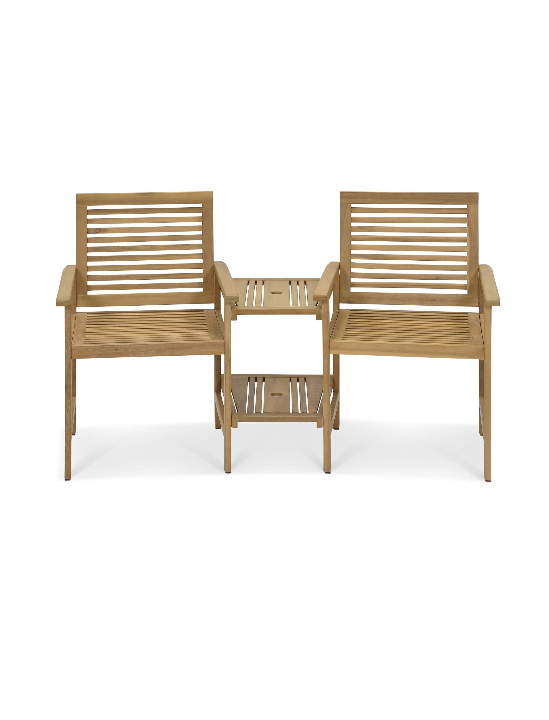 Our beautiful Titchberry Loveseat brings a romantic note to summers spent in the garden. Whether placed on a patio or tucked away in a secluded corner, this solid acacia design is perfect for sitting together to enjoy a chilled bottle of wine. This loveseat has a built-in table between the two seats that’s made for perching drinks on, while an extra shelf below will happily house an ice bucket or radio. For welcome shade in the summer heat, the table also has a hole ready for a parasol – the perfect finishing touch.