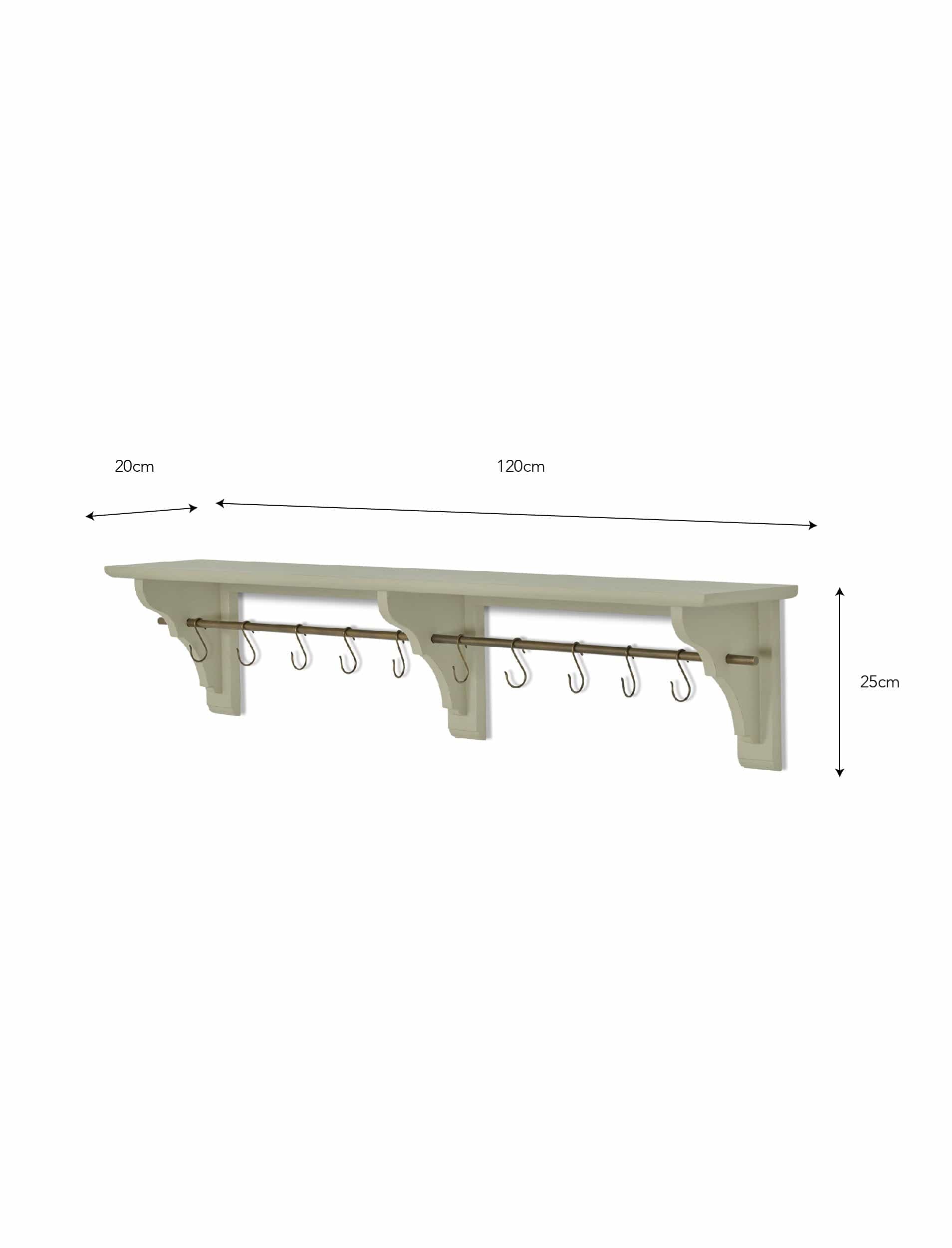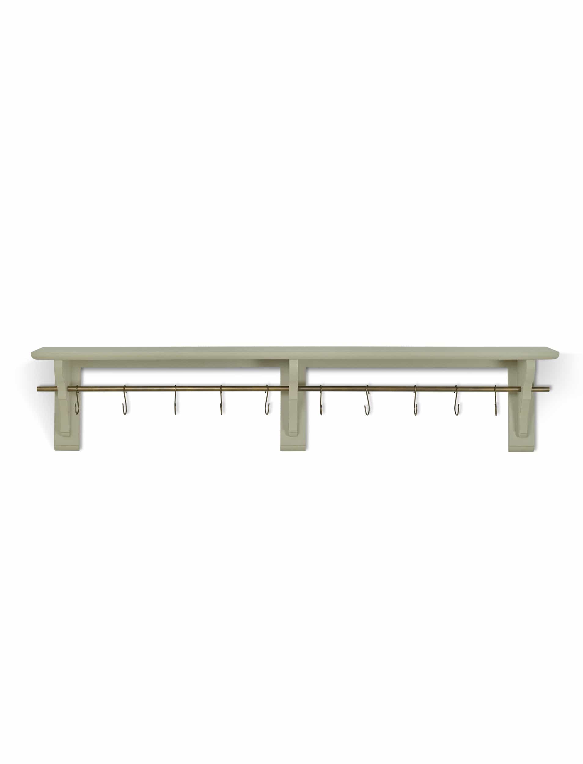 Our Walcote Shelf comes in three sizes and three colours, and this is the largest version in a neutral clay colour. Its antique brass hanging rail has ten hooks designed to hold things like tea towels and utensils, whilst the shelf that features above is ideal for displaying storage jars, cookery books and house plants. Pair it with other furniture from our Walcote range to complete the cosy cottage aesthetic.