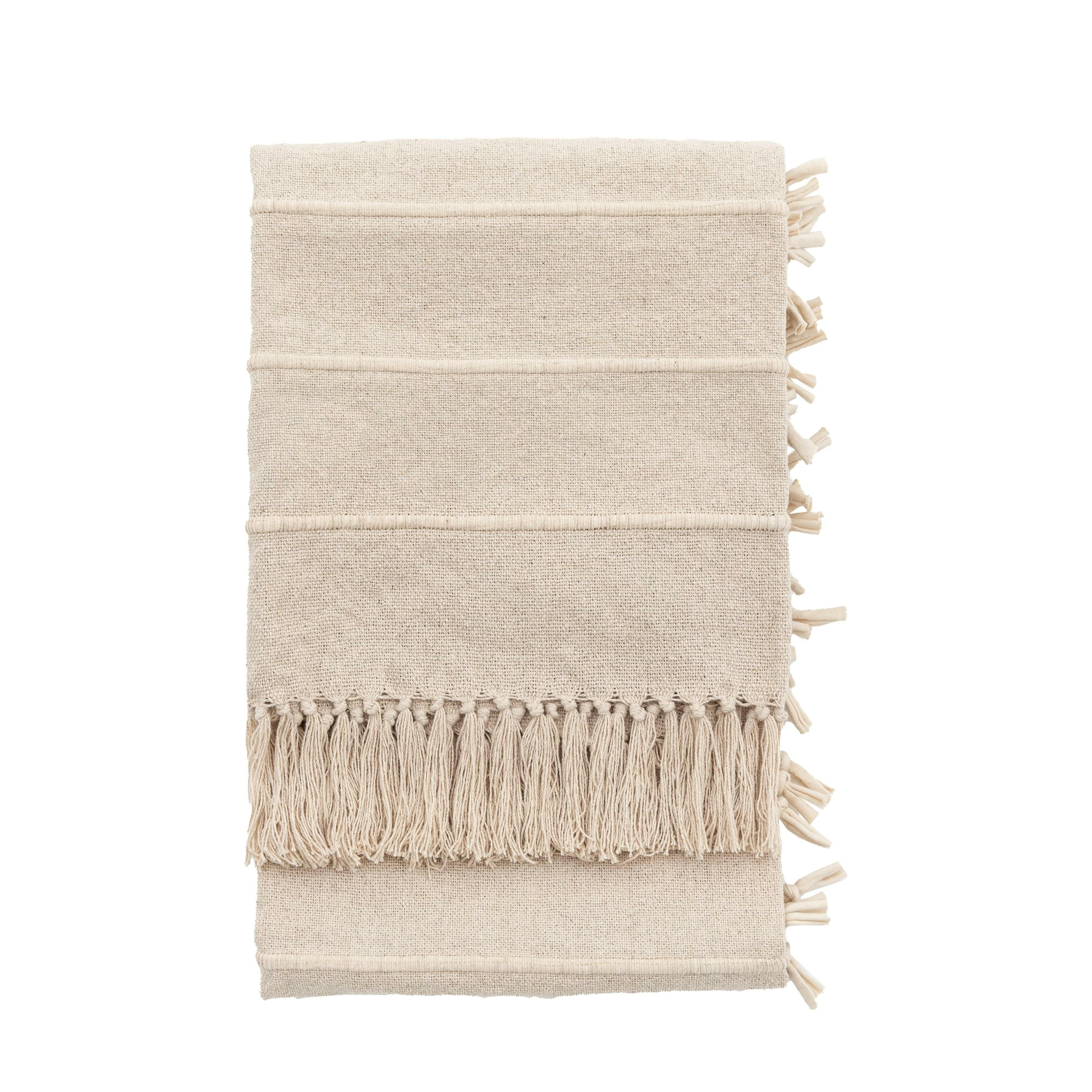 Cosy woven throw in a soft natural tone, perfect for adding texture and warmth to your space. The textured fabric features a linear design and tufted edge details, and the throw is finished off with soft fringe detail.