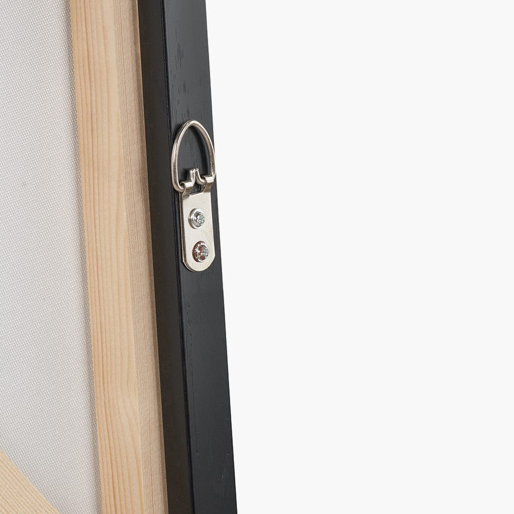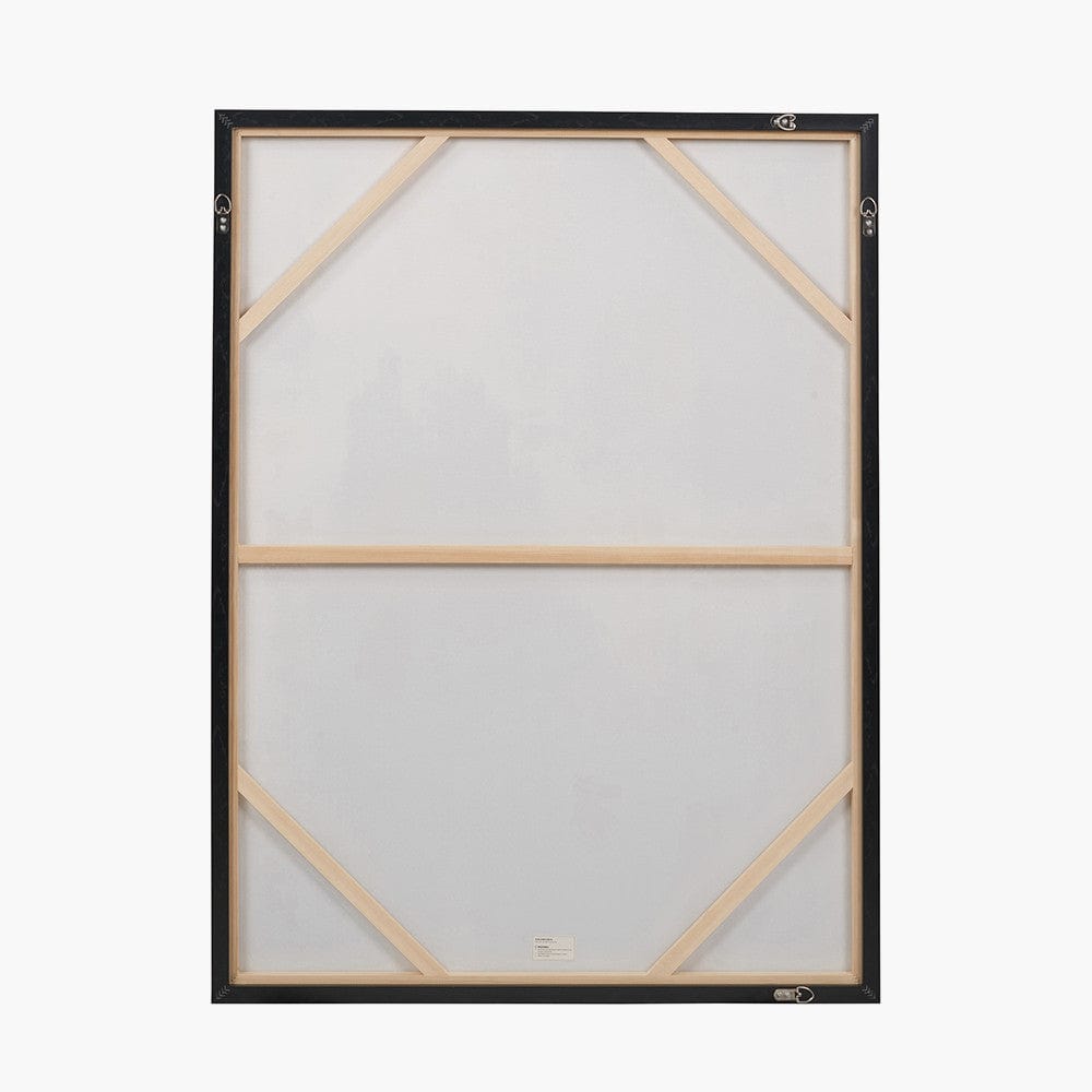 This gold and blue tone abstract canvas makes use of striking textures and high contrast design. The canvas is framed in black further pushing the highlights to the forefront of the piece and adding depth. This piece will add a sophisticated touch to any room.