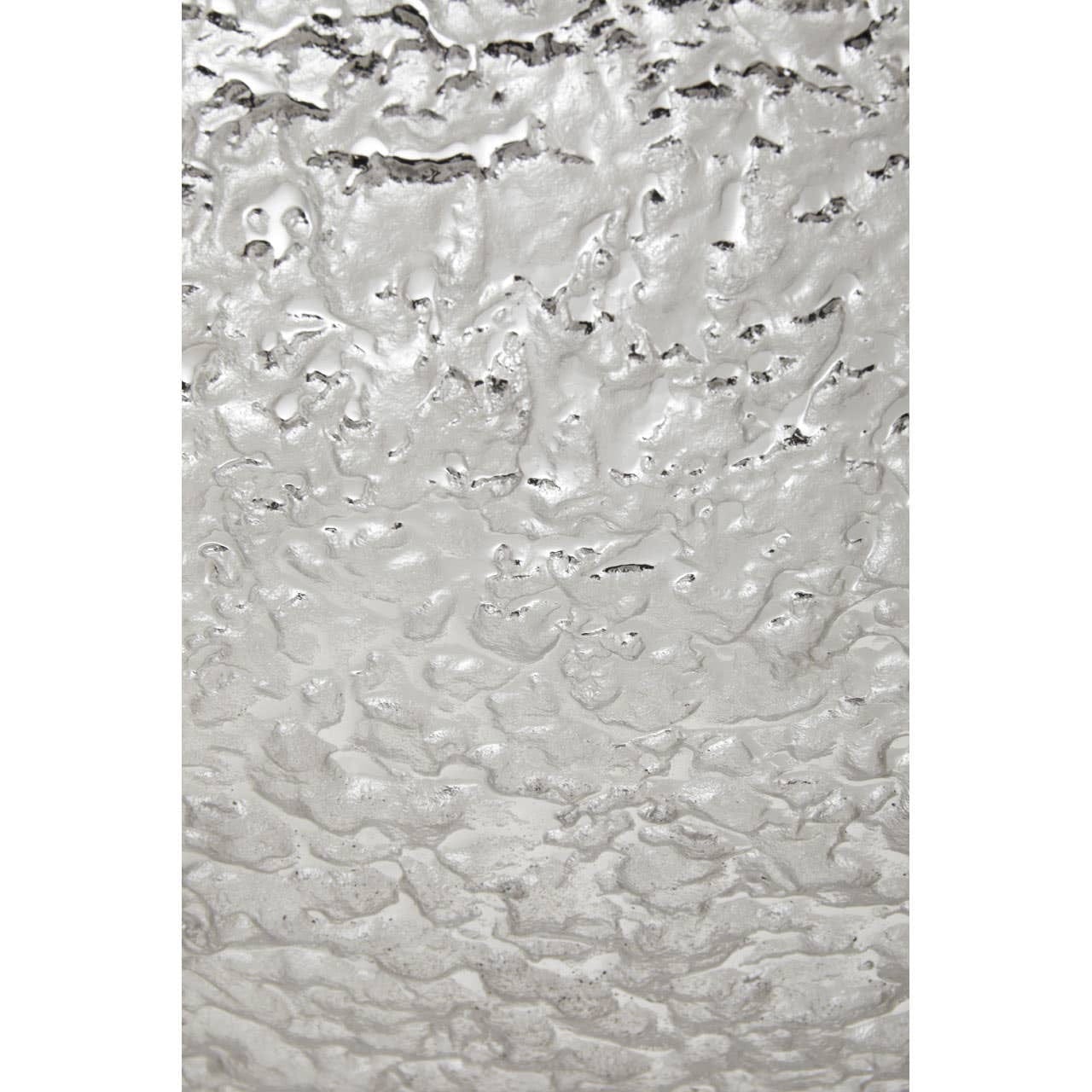 This decorative bowl is a modern statement piece, crafted from polished silver aluminium with a striking hammered metallic texture. Its broad, round surface makes it ideal for holding keys and change or displaying decorative items, adding a touch of contemporary elegance to a variety of spaces.